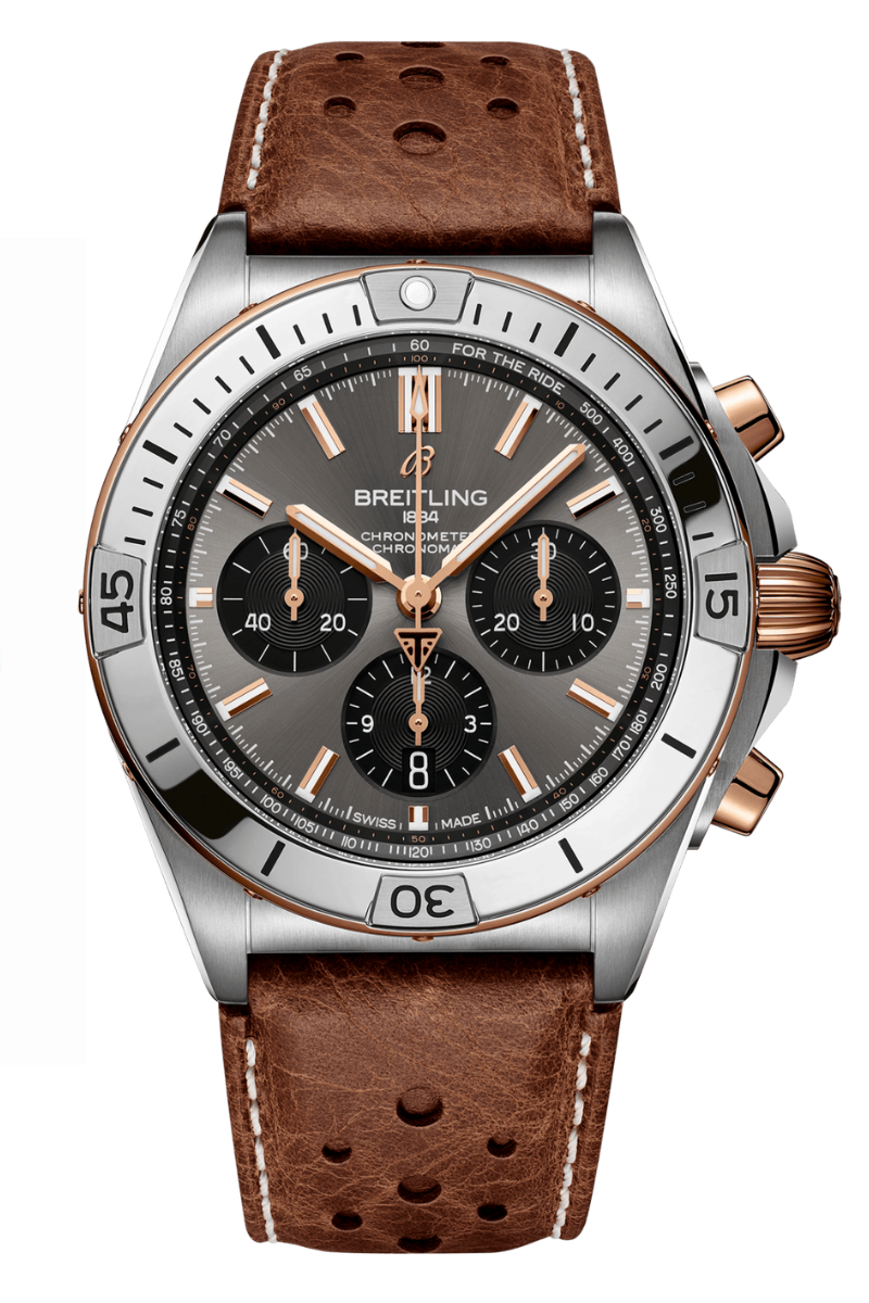 As stunning to look at as it is exhilarating to wear, the Breitling Chronomat B01 42 Triumph comes in the highest specification ever with a titanium and 18k red gold chassis. You’ll find that premium quality echoed in Triumph’s matching Breitling limited-run Speed Triple RR bike, which serves as the source of inspiration for the detailing found on this spectacular Chronomat. Note the discreet Triumph shield logo on the watch’s central chronograph hand counterweight, the “Triumph Edition” engraving on the caseback, and the perforated calfskin leather strap, finished with a folding titanium clasp.