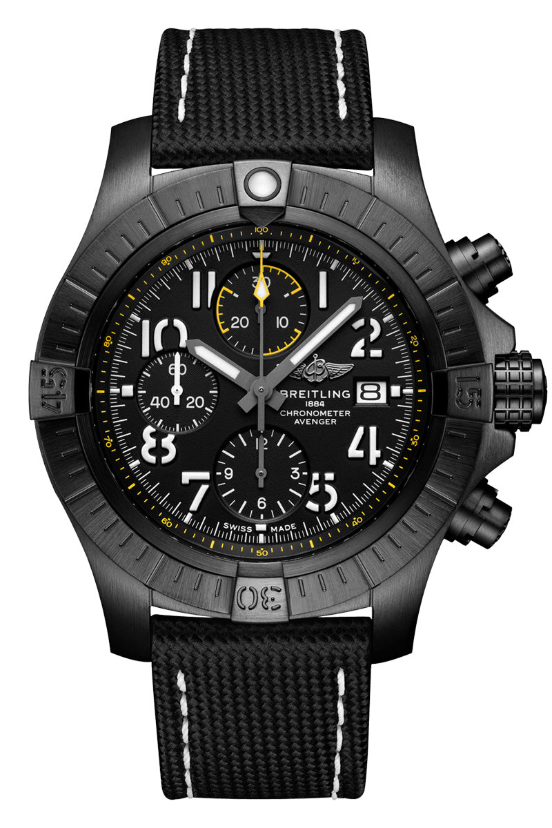 Bold, extremely robust and shock resistant, the Avenger Chronograph 45 Night Mission combines precision with a powerful design in a lightweight case. As a true Breitling Avenger, it can be used wearing gloves and offers unrivalled safety and reliability to any airborne adventurer. The Night Mission interpretation of the Avenger Chronograph 45 features a sturdy 45mm DLC-coated titanium case, black or khaki dial and a matching black or khaki military leather strap that fits either a DLC-coated stainless-steel pin buckle or folding clasp. Its specific Arabic numerals recall the stenciled numbers used on the decks of aircraft carriers. Thanks to its rugged bezel and its special grip-pattern on the crown & chronograph pushers, the Avenger Chronograph 45 Night Mission can be easily operated wearing gloves.