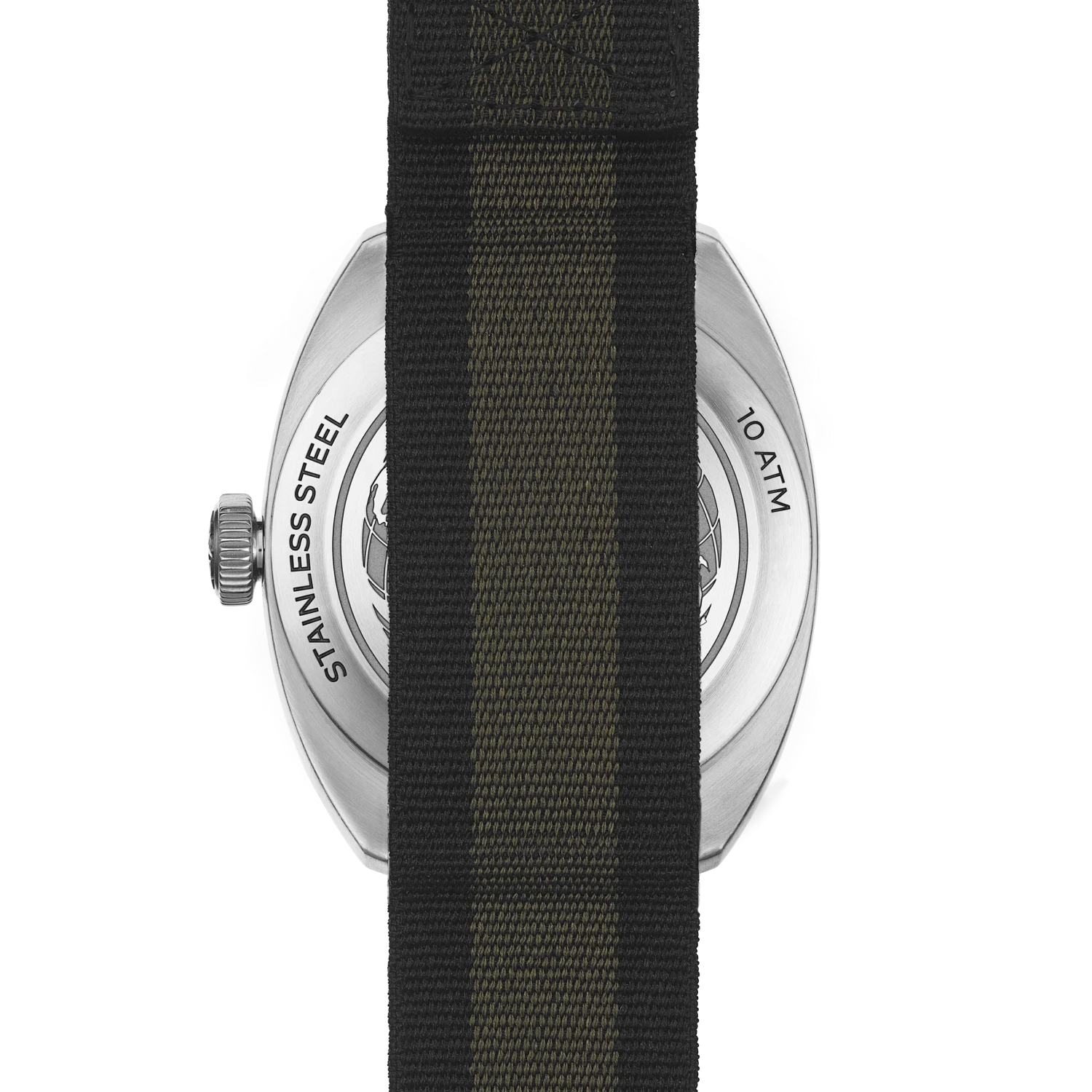- Woven fabric NATO strap with stainless steel pin buckle