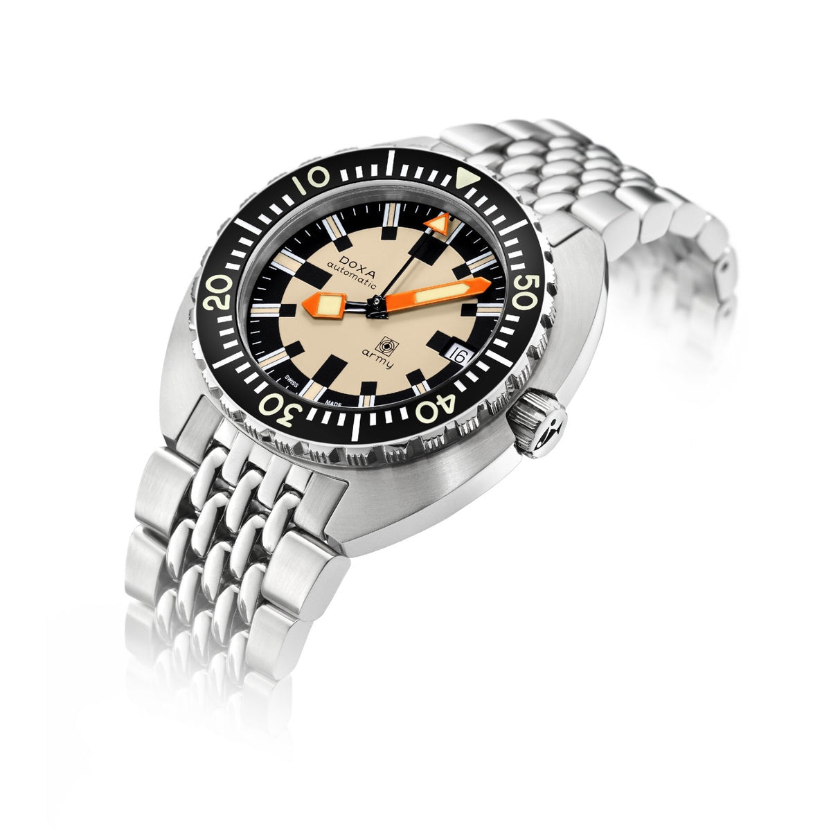 The 42.50-millimeter case of the DOXA Army, machined from a block of 316L stainless steel, is topped with a sapphire crystal. The case, and therefore the movement it protects, is resistant to a pressure of 30 ATM, equivalent to a depth of 300 meters or 984 feet. This reissue model features a unidirectional rotating bezel in bronze – marking the first time ever that DOXA has used this metal in its collections – with a hunter green ceramic insert or in stainless steel with a black ceramic insert.