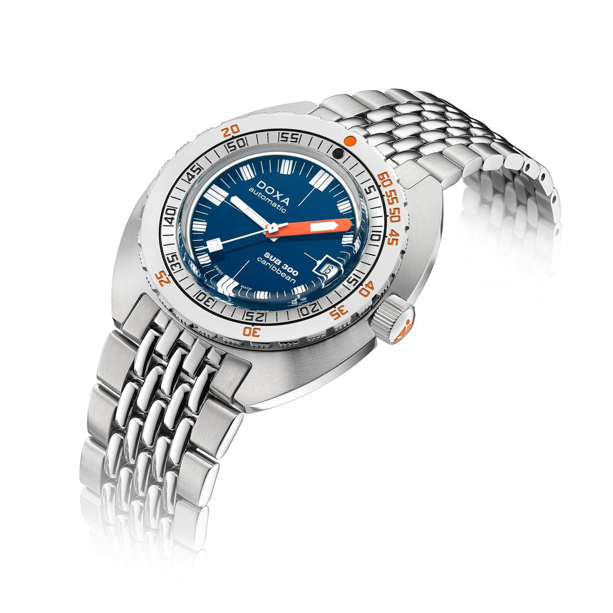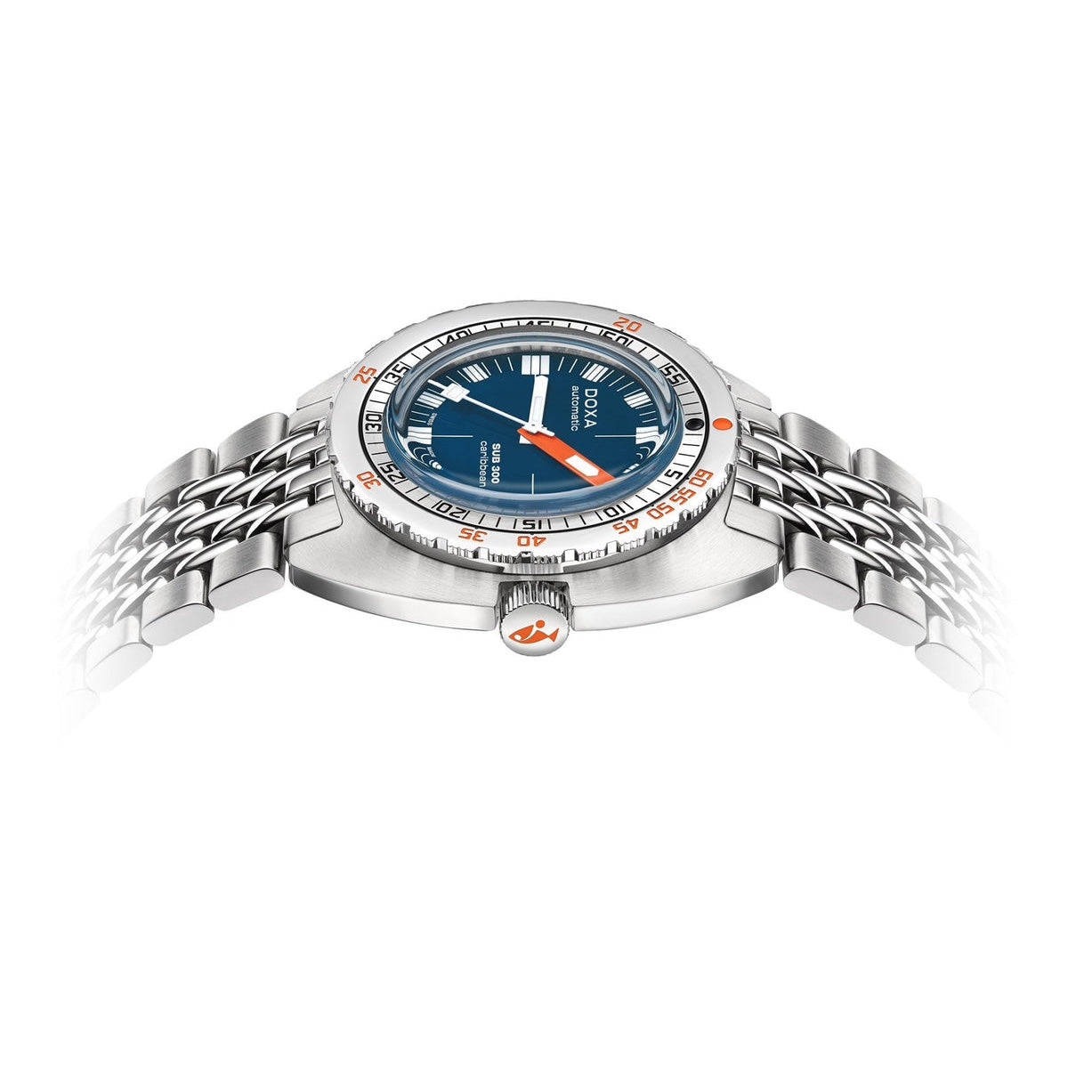 The SUB 300’s 42.5 mm case is made from the highest quality 316L stainless steel. The three-hand self-winding movement holds the prestigious COSC Certified Chronometer certification guaranteeing precision, robustness and reliability. It also provides a 38-hour power reserve. The date window is positioned at 3 o'clock. The SUB 300 naturally features the famous unidirectional rotating bezel, a DOXA patent, with the dual indication of dive time in minutes and depth in meters for calculating no-stop decompression dive times. Featuring a screw-down crown, its water-resistance is rated to 300 meters, or approximately 980 feet.
