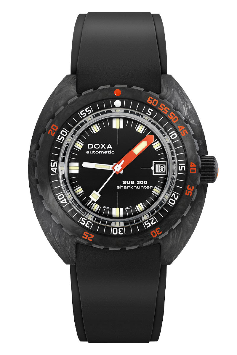 Featuring distinctive DOXA cues on both sides, the strap is fitted with a black PVD-treated folding clasp decorated with the exclusive DOXA fish symbol. It also has an adjustable diving extension to accommodate the thickness of a wetsuit.