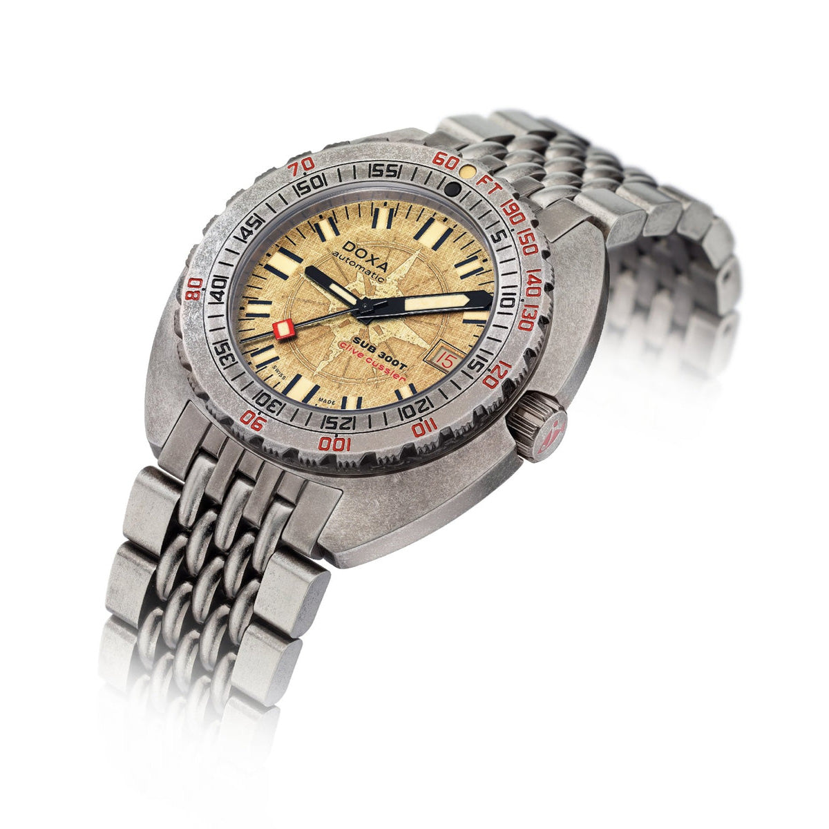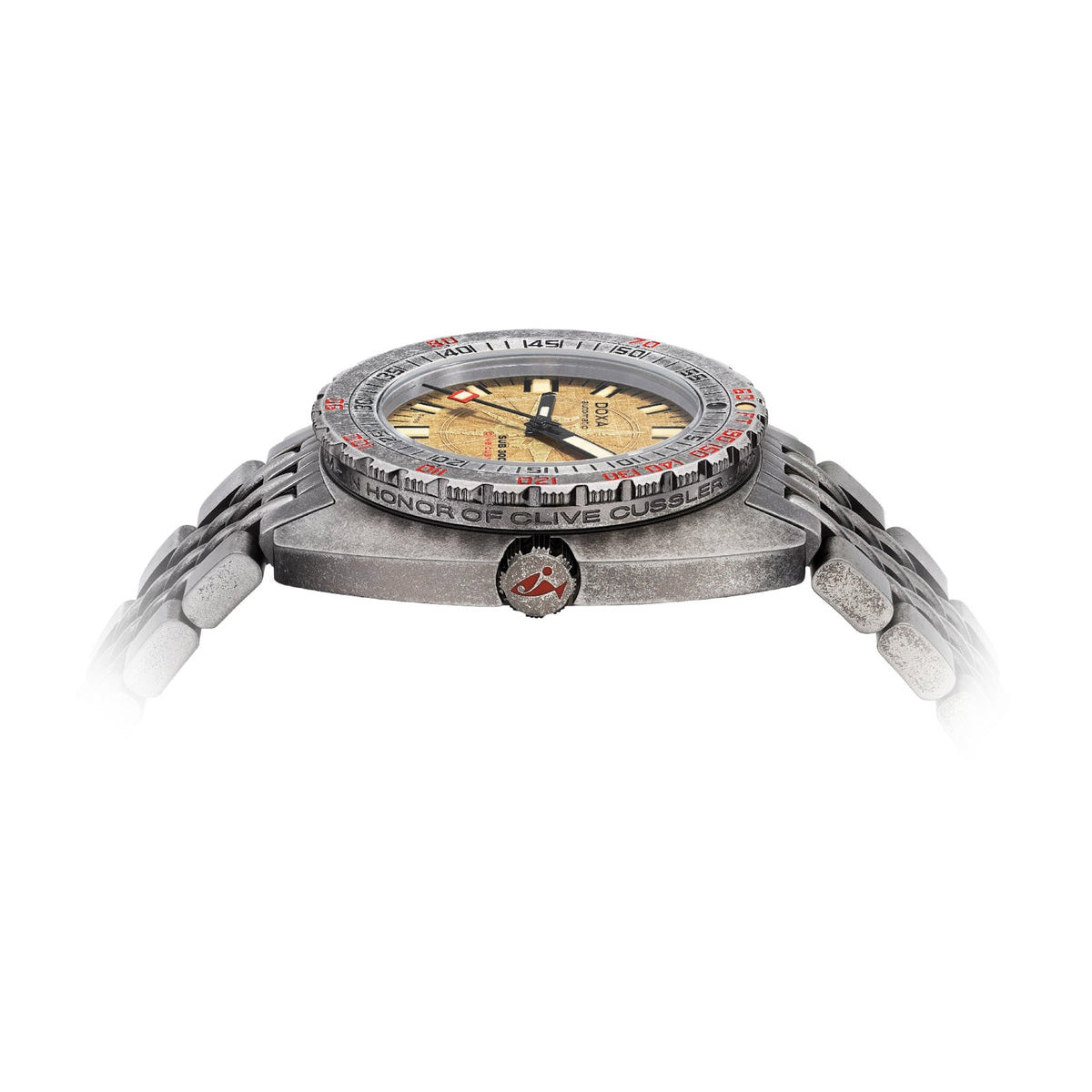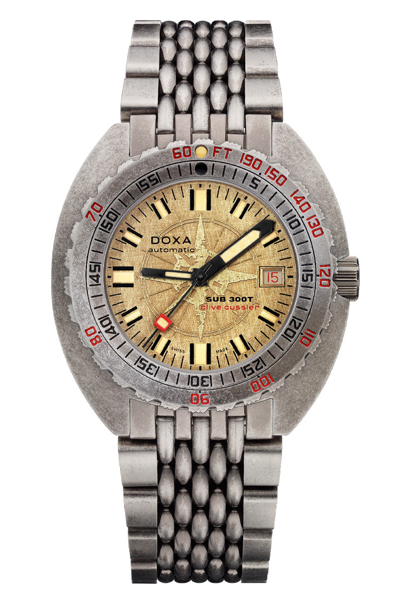 The SUB 300T Clive Cussler stays true to the collection’s core characteristics while remaining highly distinctive. With an original handmade dial evoking a vintage compass, and the use of an aged steel appearance applied to the watch, bracelet, clasp, and pin buckle, the watch is intended to have a weathered look, perfect to be featured on the wrists of adventurers in one of Cussler’s novels. This timepiece’s aged effect is a reflection of a nautical artifact’s journey and the conditions it endured during its time submerged in the depth.