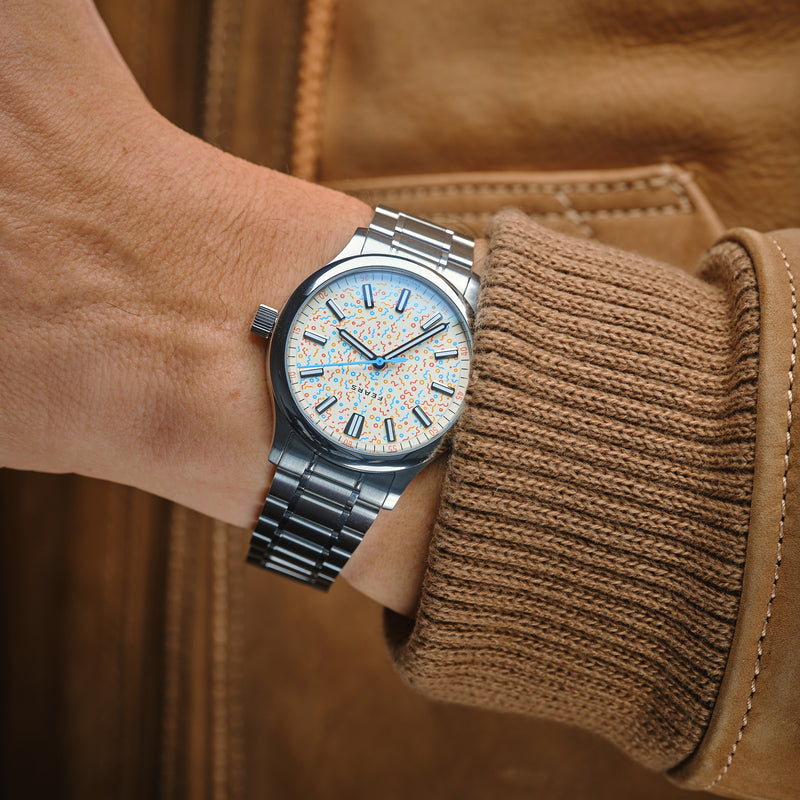This Redcliff Confetti is fitted with a new bespoke 3-link stainless steel bracelet, which is equipped with a micro-adjustment feature tucked into the trigger-release clasp. The watch includes an additional quick-change textile strap, enabling the wearer to easily swap out the look.