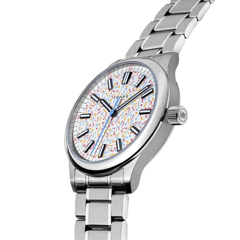 The Redcliff is Fears’ most sporty, contemporary offering, built around a svelte 39.5mm round case with integrated lugs and a screwdown crown and caseback. This new ‘Confetti’ Burlingame Edition is characterized by its delicate ivory-colored lacquer dial, which is embellished with an all-over confetti motif cast in multi-color lacquer – a lighthearted totem of celebration for all of life’s most important milestones. Twelve diamond-polished hour markers encircle the dial, each generously filled with SuperLuminova X1-Grade lume. Completing the dial is Fears’ own handset, each of which are tri-bevelled and diamond polished before being finished in a coating of black gold (thus matching the indices), yielding a high degree of legibility when combined with the X1-grade Superluminova.