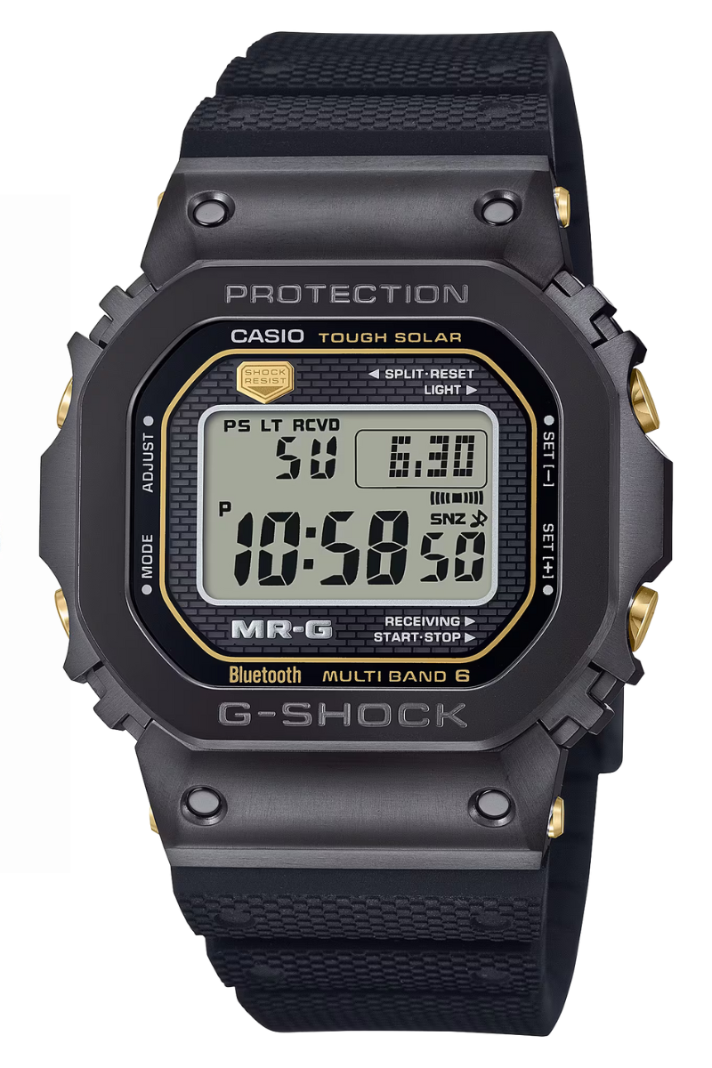 As a nod to the black-and-gold colors of the earliest G-Shock models, this MRG reference features pushers and bezel components ion-plated in gold against a base of black diamond-like carbon coating. Touches of gold vapor deposition add bold interest to the watch face, and the iconic brick pattern is a nod to the original DW-5000 G-SHOCK design. Inside, this MRG-B5000 delivers G-Shock's unbeatable feature-rich utility and timekeeping, using radio-controlled calibration and smartphone pairing via Bluetooth.