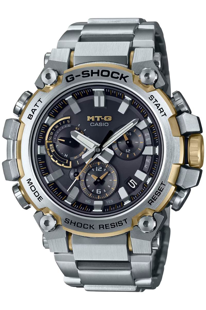 The MTGB3000 features an even lighter layered composite band made of stainless steel and fine resin. Its stainless steel bezel is ion plated in black, then treated with a hairline finish to expose the stainless steel below the convex surfaces only. These meticulous details come together to offer an intricate and sophisticated design.