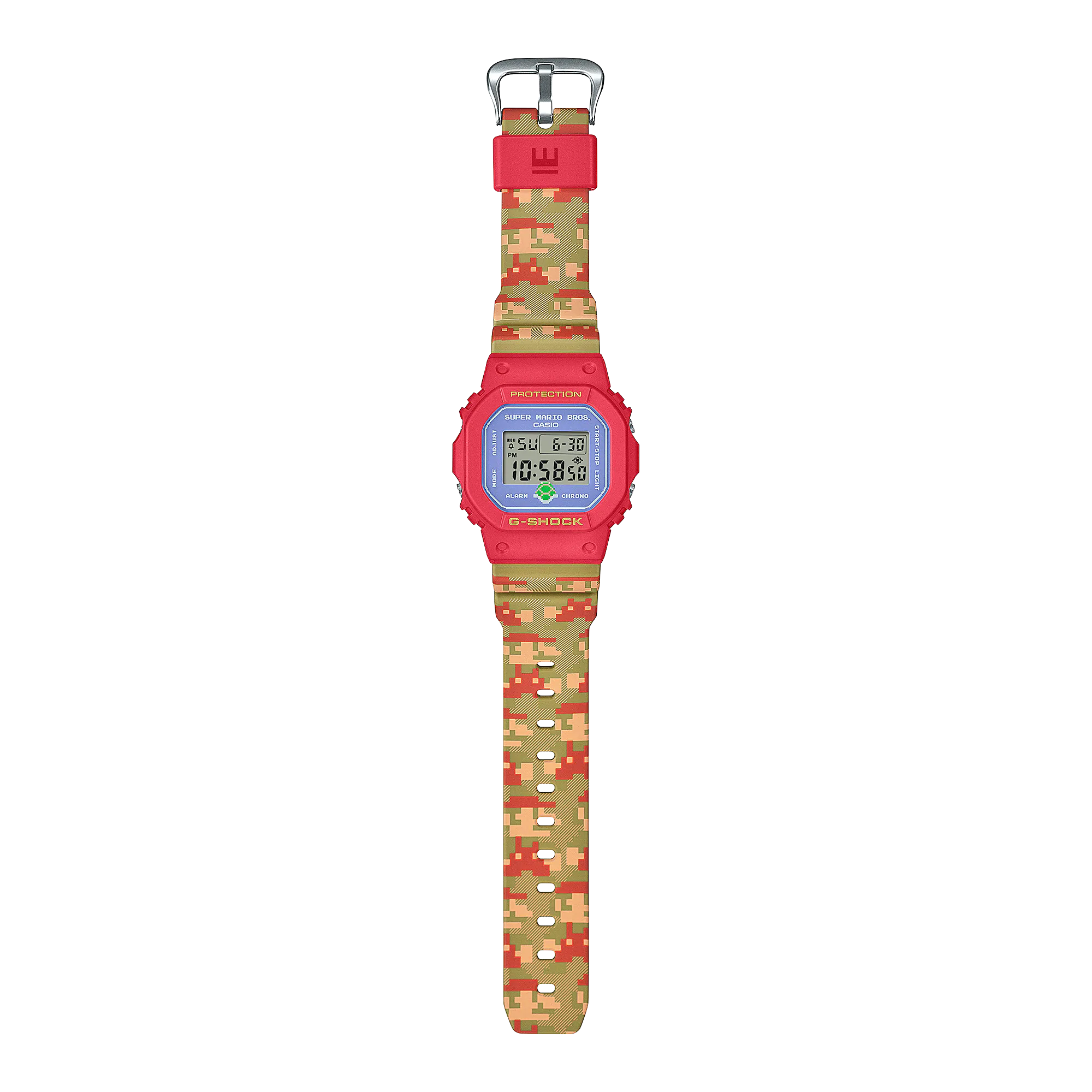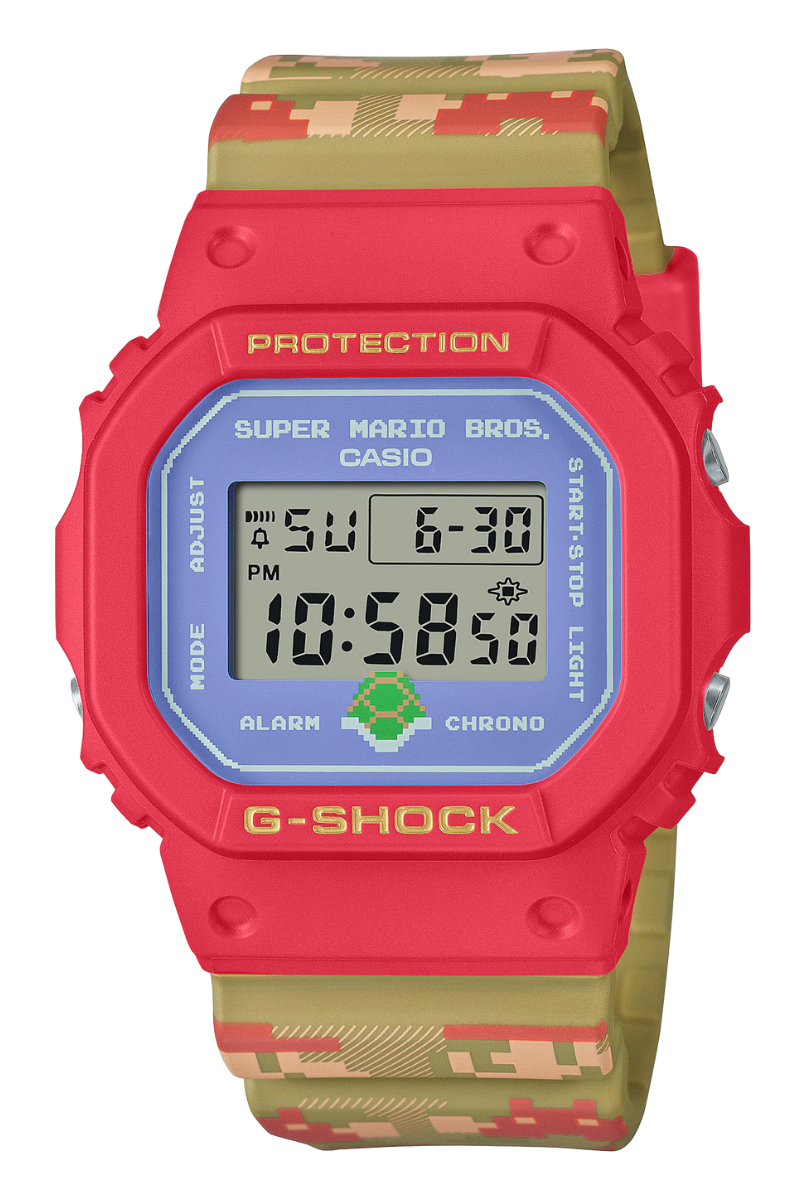 Two cultural icons straight out of Japan meet in this limited edition Super Mario Bros. themed G-Shock. The seminal video game that continues even today to captivate fans around the world comes to life with familiar red & gold colors and a whimsical design replete with character signatures from the classic game, all housed in a classic and feature-rich G-Shock DW5600 square resin case.