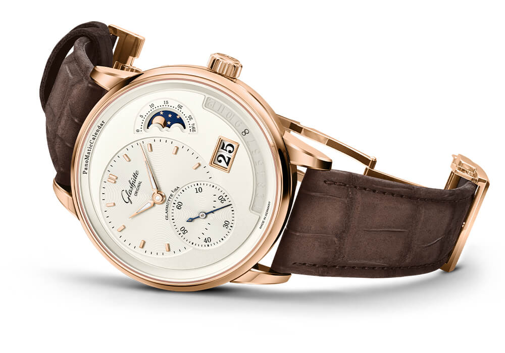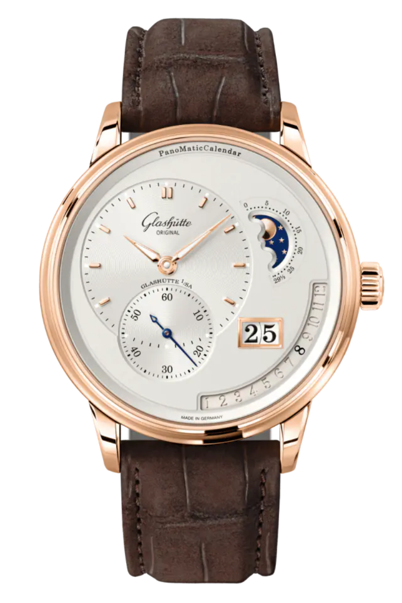 The PanoMatic Calendar combines sophisticated German micro-engineering and handcrafted watchmaking techniques with an original design. Cast in red gold, the Glashütte Original PanoMatic Calendar is at once contemporary, purist and unmistakable. Its 42mm case is slightly domed and sits comfortably on the wrist. The dial on this model is in silver opaline, while the auxiliary dials for hour, minute and small seconds appear with a finely fluted vinyl-type decorative pattern. Golden appliques and hands coated with Super-LumiNova® set brilliant accents, which are taken up by the golden frame of the Panorama Date.