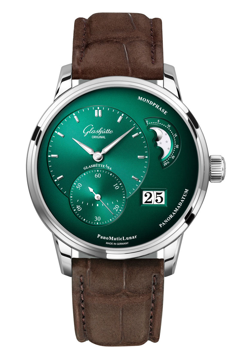Glashütte Original often takes inspiration for the color of its dials from the natural beauty of the Ore Mountains. This time, the tall fir trees surrounding the manufactory inspired the designers to capture the intense shades of green and to immortalize them on the dial of the new PanoMaticLunar. Working closely with their colleagues in the watchmaker's in-house dial manufactory in Pforzheim, they transformed the brass dial blanks into green masterpieces, and the perfect centerpiece for the brand's signature moonphase movement.