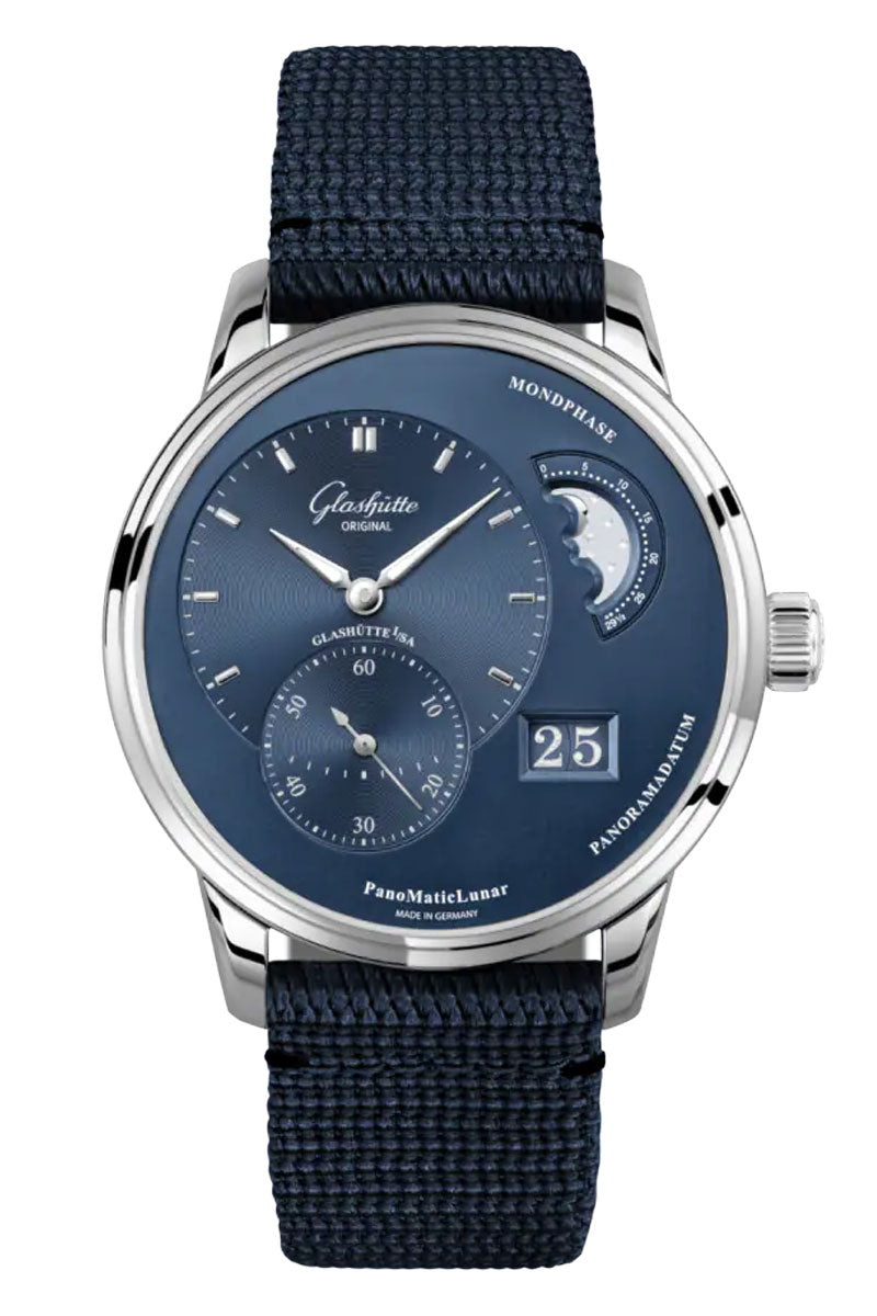 - Dial: Blue, PVD coated, surface fine matt, indices applied, printed scales, white Panorama Date on blue background, moon phase display silver/silver