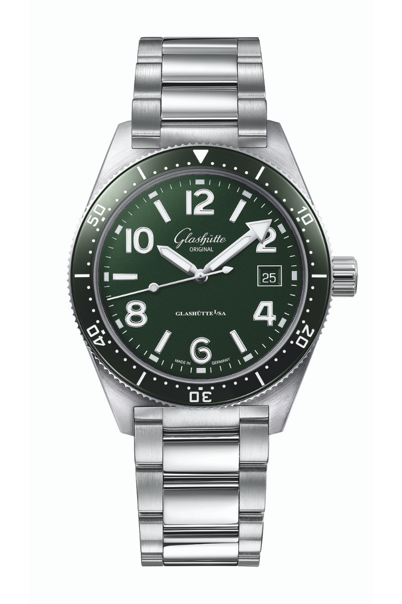 - Dial: Galvanic "Reed Green" with sunray finish, numerals and indexes with Super-LumiNova, hands laid out with Super-LumiNova