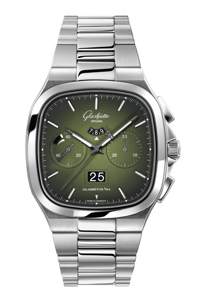 The Seventies Chronograph Panorama Date from Glashütte Original celebrates a world on the move in the 1970s, where travel, self-realisation, flexibility and a return to nature became more outspoken social norms. This newly updated version is presented in polished stainless steel, with its compact 40 x 40 mm diameter case whose rounded corners echoes the design icons of the dynamic decade it is named after.