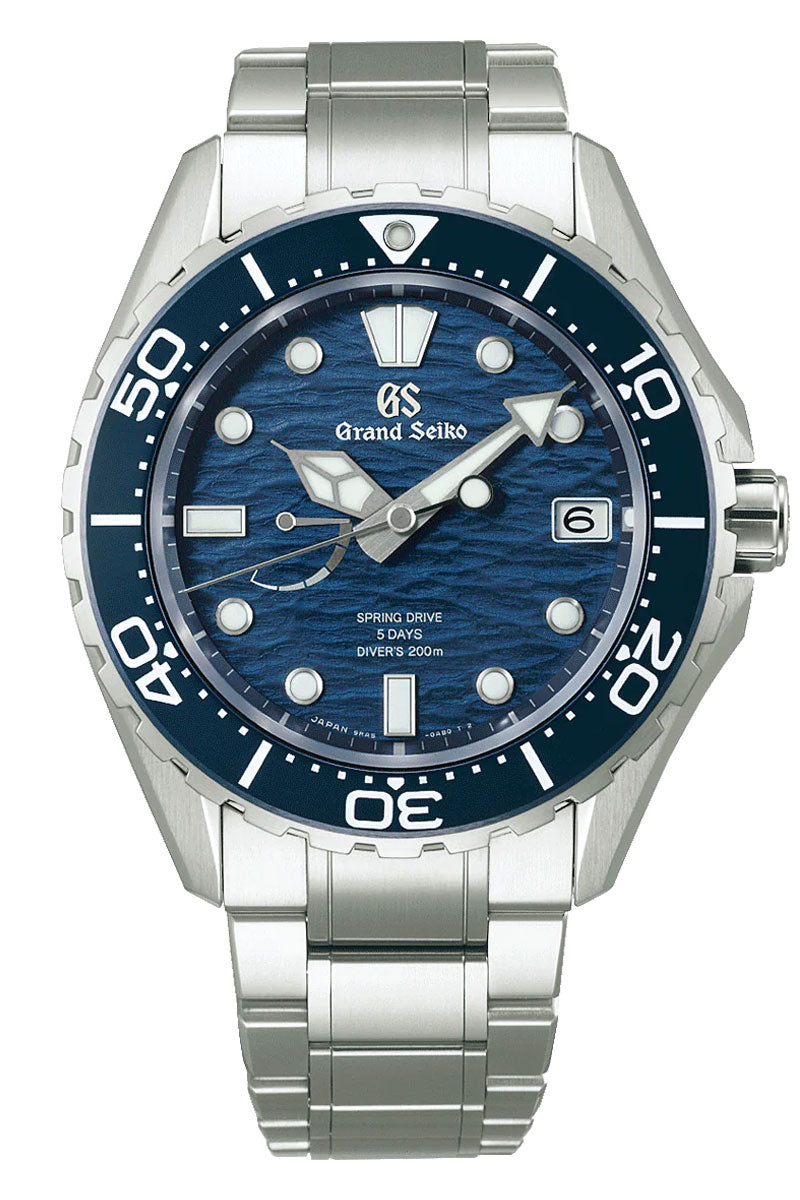 This year’s newest addition is a new variation of the Spring Drive diver that premiered a year ago, only this time around the black wave-pattern ushio dial and the ceramic bezel have been exchanged for another highly appropriate color, Grand Seiko blue.