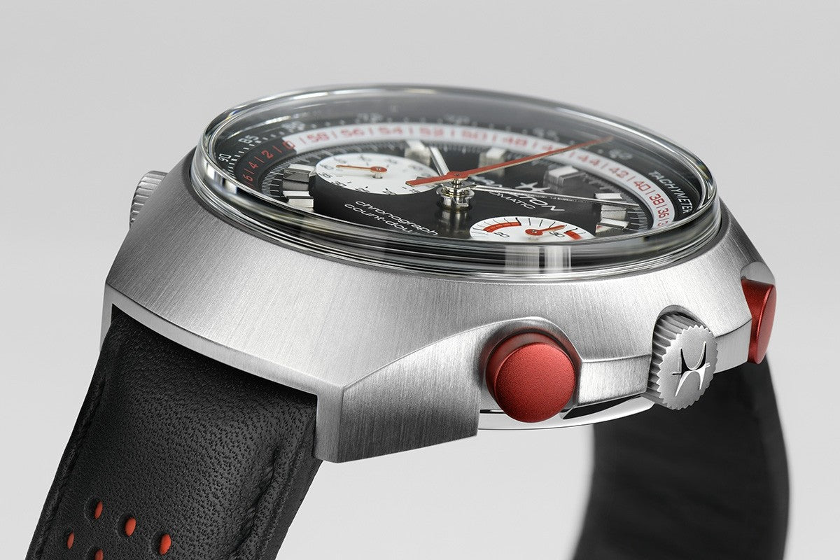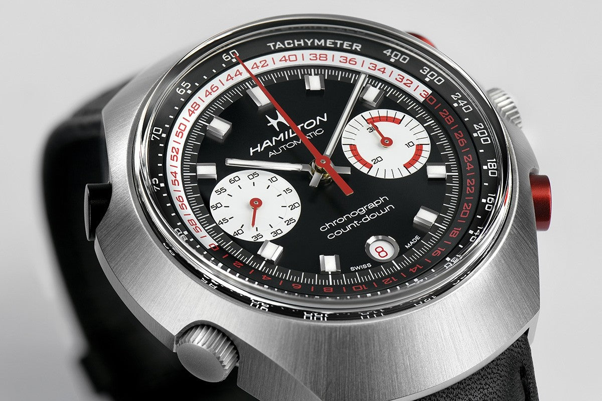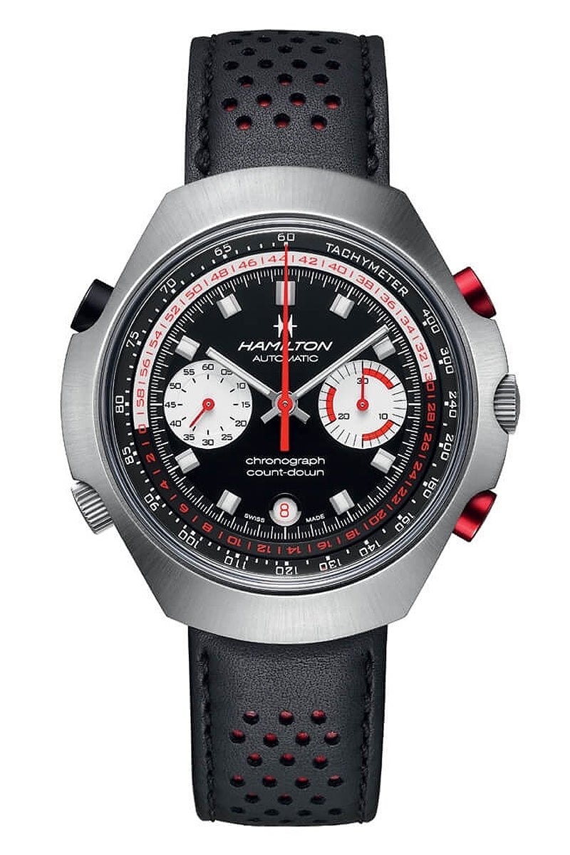 Distinctive, daring and definitely an attention-grabber, the Count-Down is based on the Chrono-Matic E and limited to 1,972 pieces. Powered by the H-31 automatic movement, at 48 mm, it's not for the faint hearted. The reverse panda dial is a signature Hamilton style statement. Bold red color accents underscore the dynamism of this multifunctional timekeeper which includes a countdown scale that gives the watch its name.