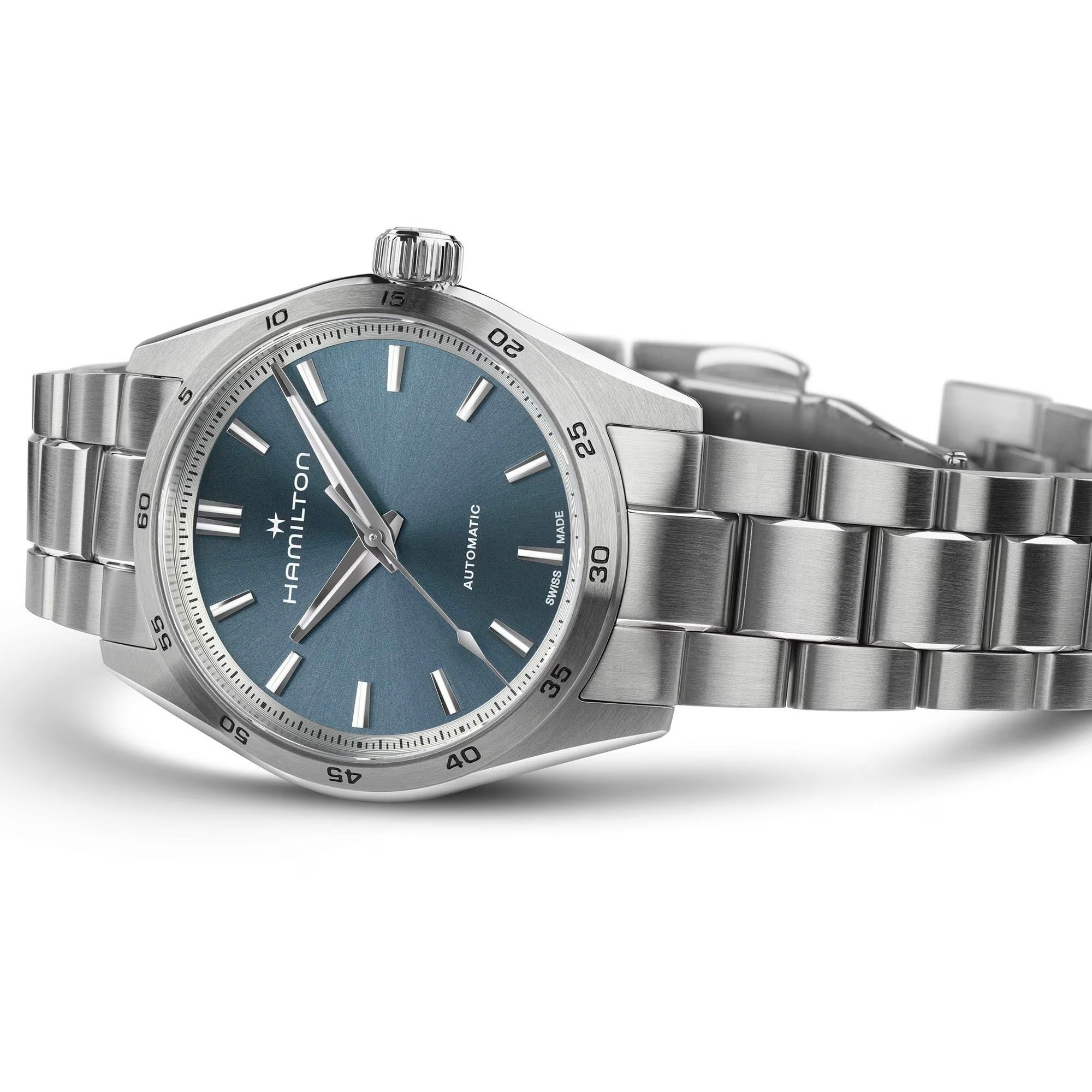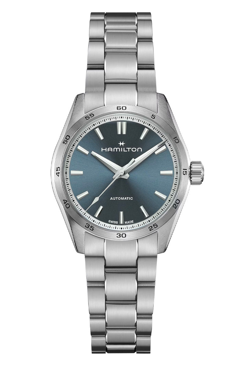 Made for those who favor function and style at once, the Jazzmaster Performer line offers a powerful sport-chic appearance. Powered by the H-10 automatic movement with 80 hours power reserve, this Jazzmaster Performer Automatic features a 34mm stainless steel case accented by an understated light blue dial and a refined stainless steel bracelet.