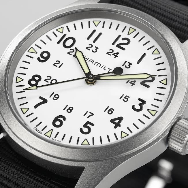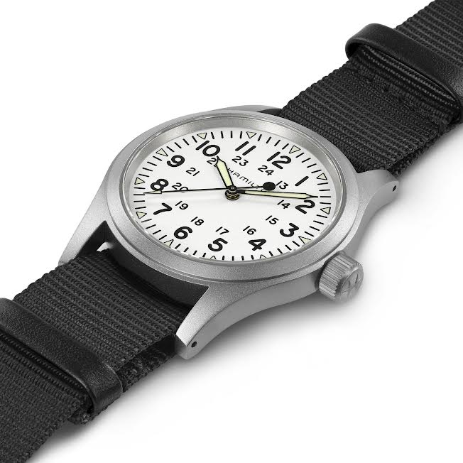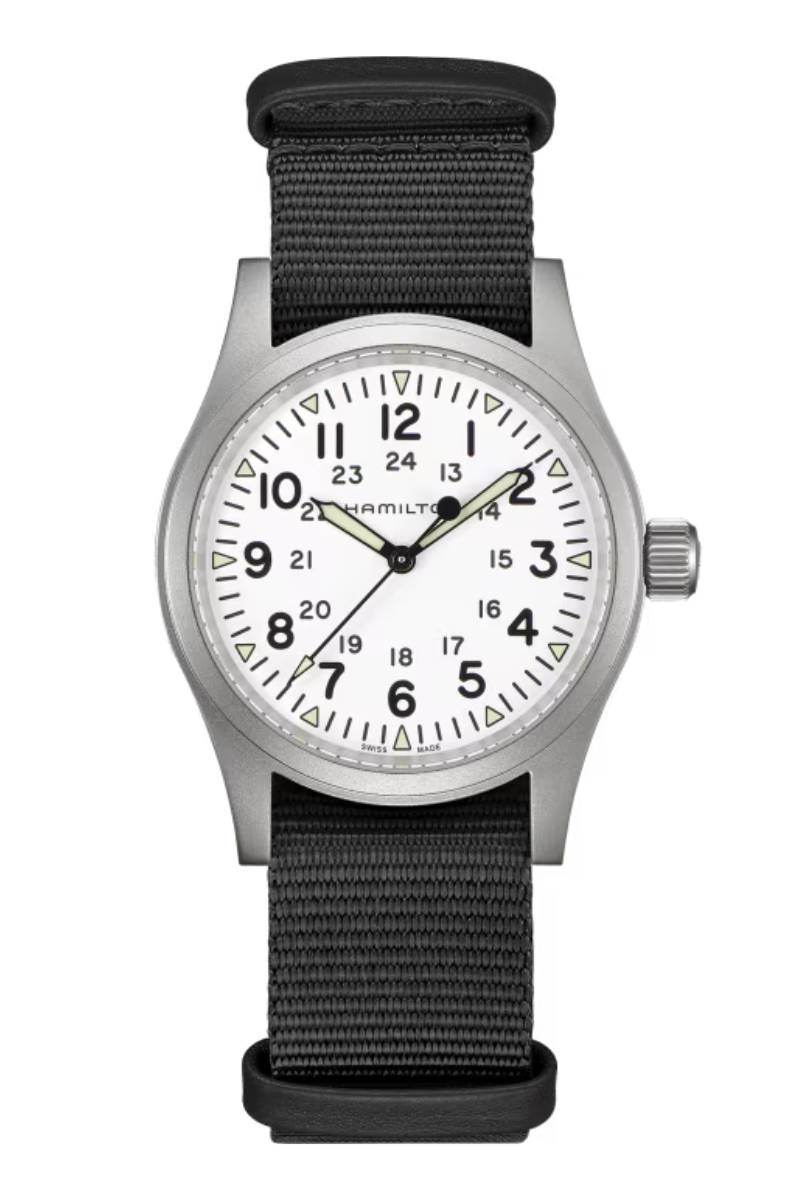 With a classically proportioned 38mm matte stainless steel case, three hand display, dark dial with light, luminescent numerals, indexes showing hours and minutes, durable NATO strap: this Hamilton Khaki Field Mechanical is a faithful recreation of its original 1960s forebear and is true to the maker's heritage. Inspired by the military and built to last, this is the original soldier’s watch.