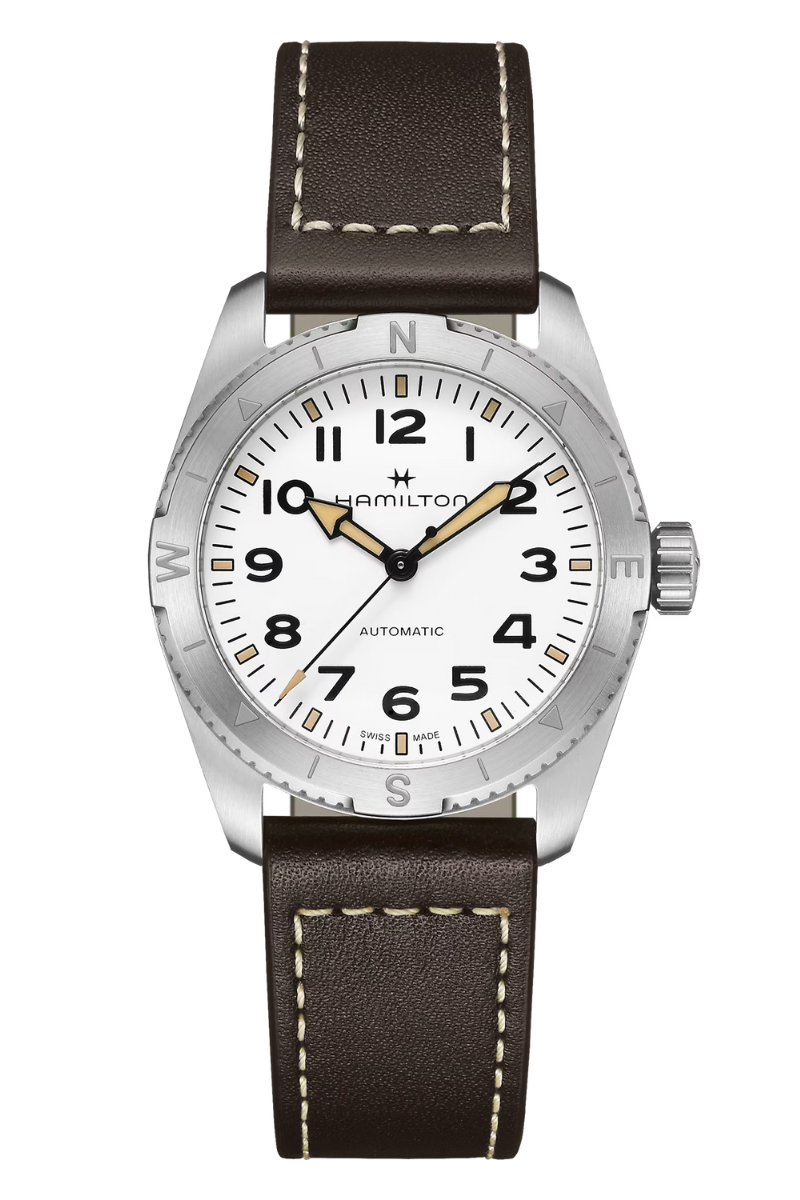 Gear up for the great outdoors with the Khaki Field Expedition, an all-terrain adventure watch with a compass design enabling you to navigate your adventure with the help of the sun. Housed in a 37mm stainless steel case paired with a brown leather strap, it is equipped with a screw-down crown to protect the movement no matter the weather. Featuring a white textured dial with Super-LumiNova® coating for ultimate legibility, the Khaki Field Expedition is tough when you need it.