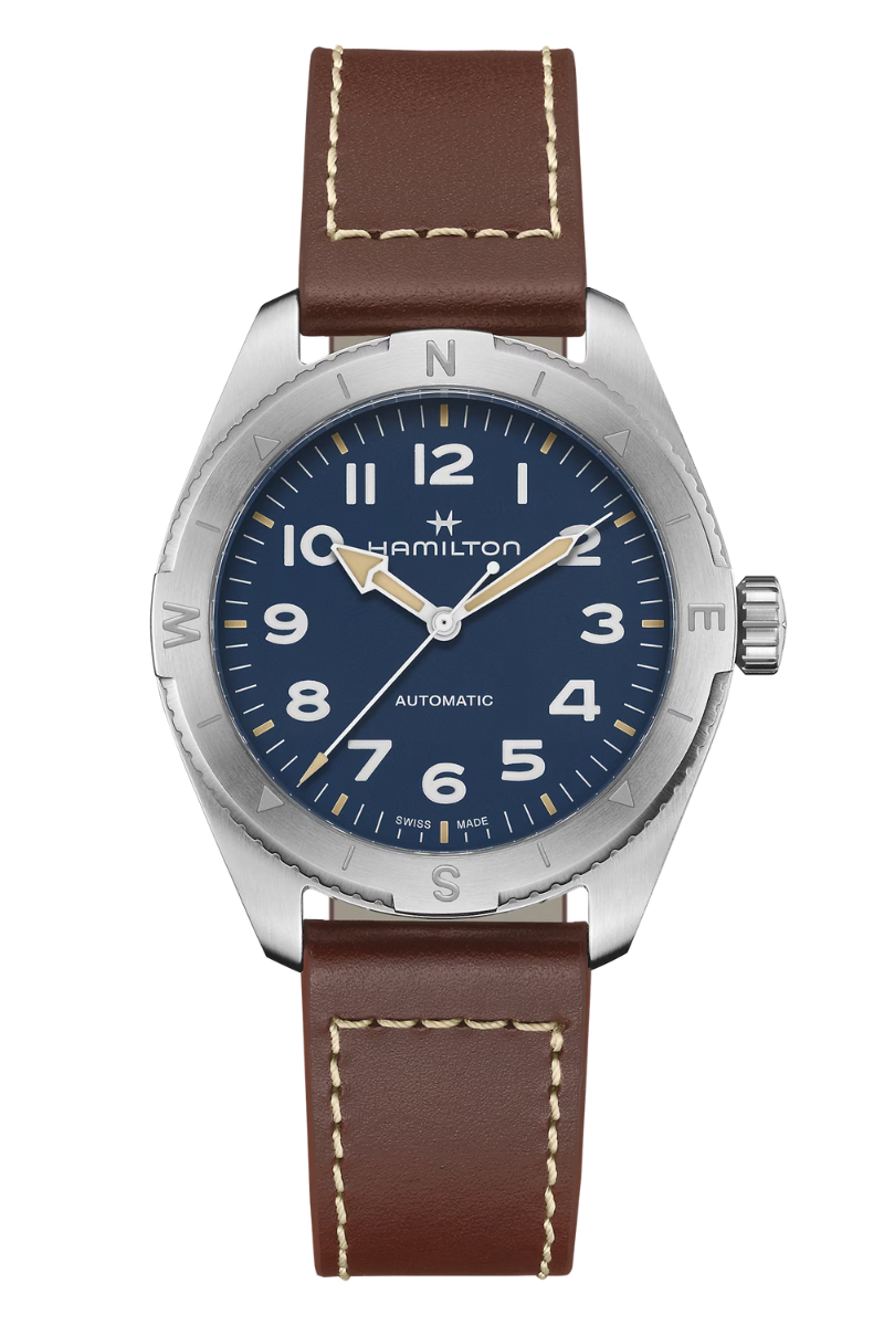 Gear up for the great outdoors with the Khaki Field Expedition, an all-terrain adventure watch with a compass design enabling you to navigate your adventure with the help of the sun. Housed in a 41mm stainless steel case paired with a rich brown leather strap, it is equipped with a screw-down crown to protect the movement no matter the weather. Featuring a black textured dial with Super-LumiNova coating for ultimate legibility, the Khaki Field Expedition is tough when you need it.