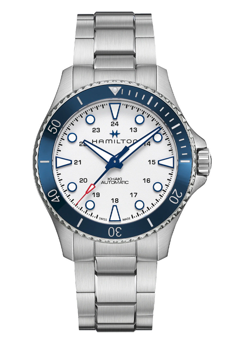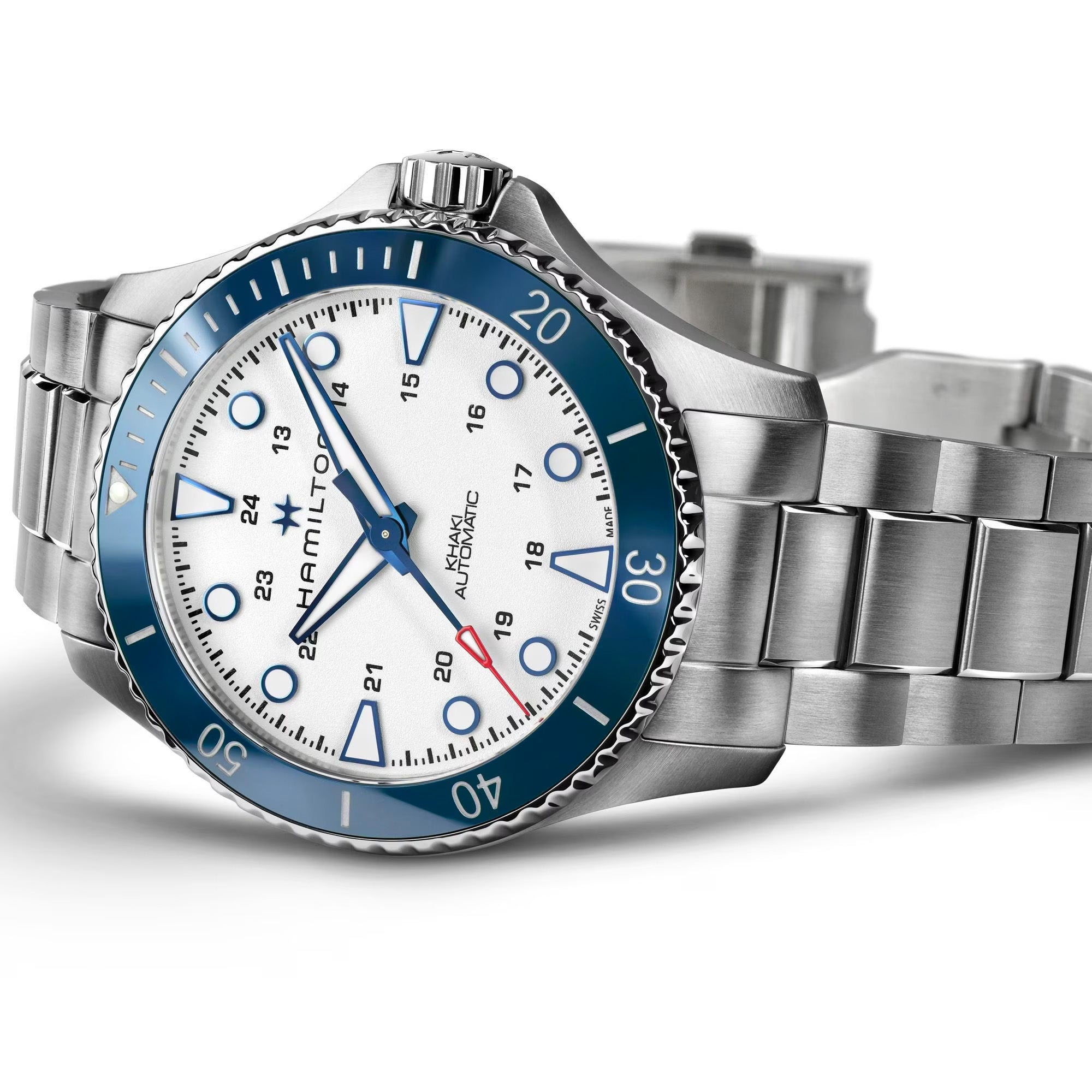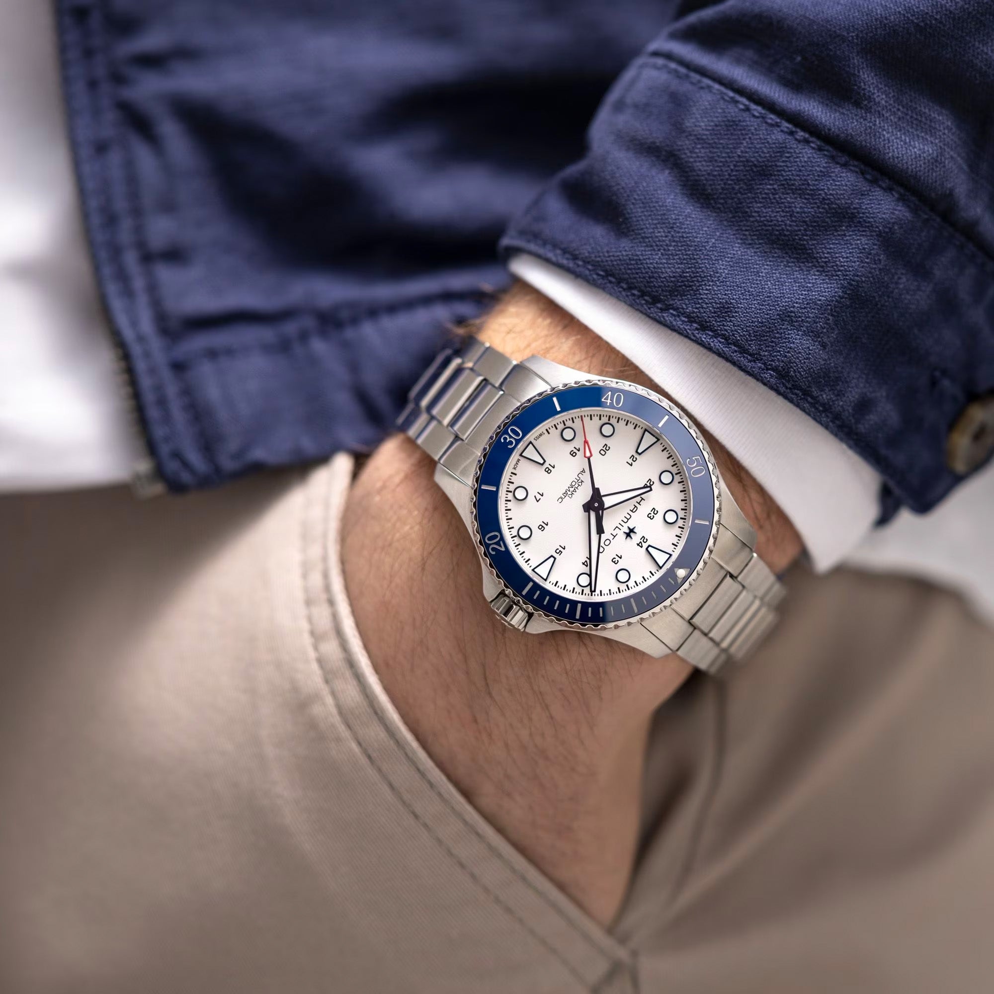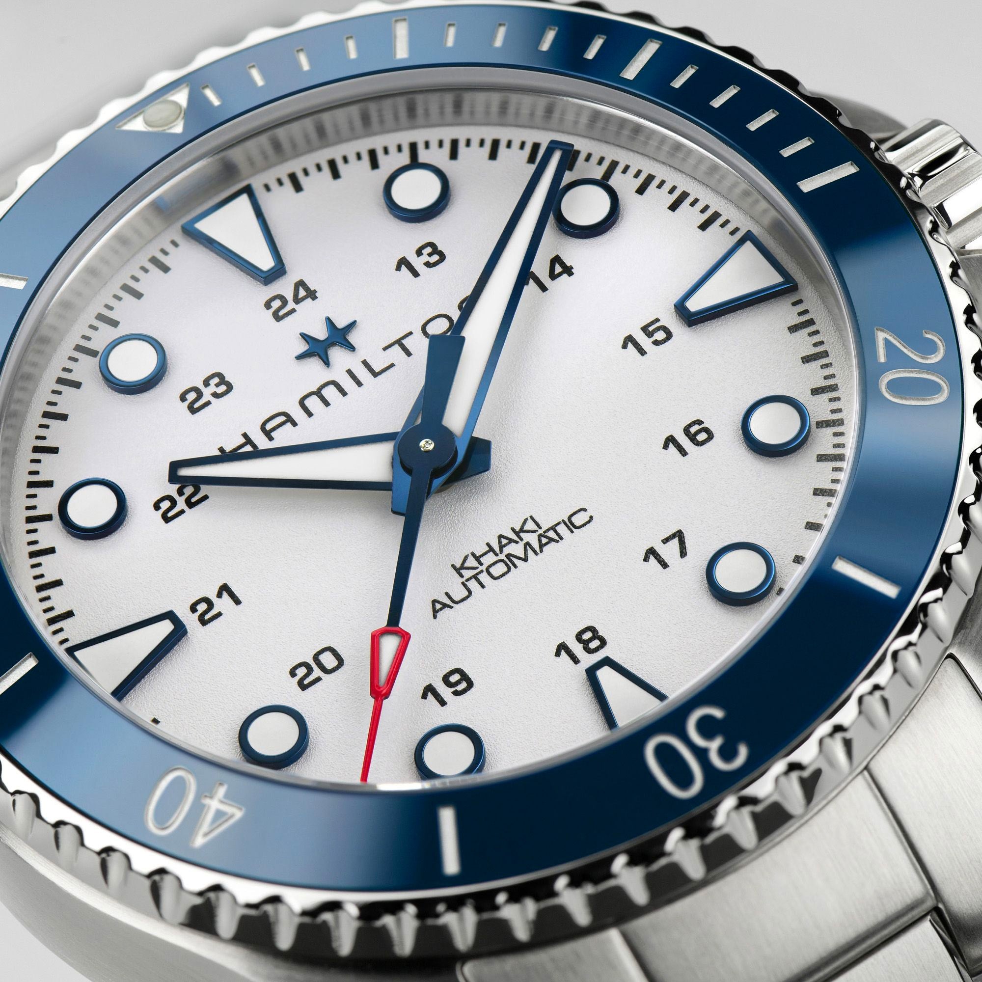 Get ready for a summer at sea with this Khaki Navy Scuba Automatic. Designed to withstand corrosive elements like sand and salt, its strikingly blue ceramic bezel adds high-seas style to this aquatic-inspired essential.