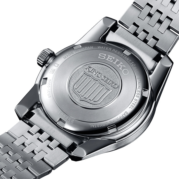 Following the successful 2021 recreation of the elegant dress & sport King Seiko of the 1960s, this new reference re-interprets one of Seiko's most technically innovative brands, noted for its sleek, dignified angularity. A newly developed slim case and the thin 6R31 automatic movement, with a frequency of 21,600 vibrations per hour, a power reserve of approximately 70 hours, and manual winding capability, make this re-interpretation exceptionally slender and elegant, with a case thickness of only 10.33 mm. The clean sunray dial features meticulously cut three-dimensional indices, including a separately carved 12 o'clock marker, while the box shaped crystal offers anti-reflective coating on the inner surface. Crafted of stainless steel, with the combination of mirror and hairline finishing characteristic of the original King Seiko, and the King Seiko crest on caseback and crown. Includes a tri-fold push button release clasp.