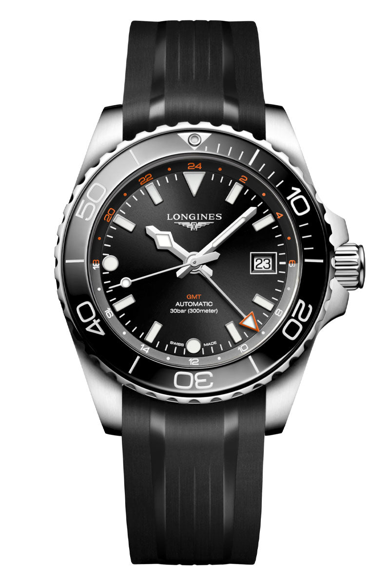A true classic among sports watches that combines both elegance and technical excellence, the Longines HydroConquest dive watch has been augmented with a sleek new design and a Longines-exclusive GMT movement which simultaneously displays two time zones and features a quick-adjust hour hand, which is perfect for travel. A notched, unidirectional rotating dive bezel with a ceramic insert ensures complete safety once diving that far-flung locale.
