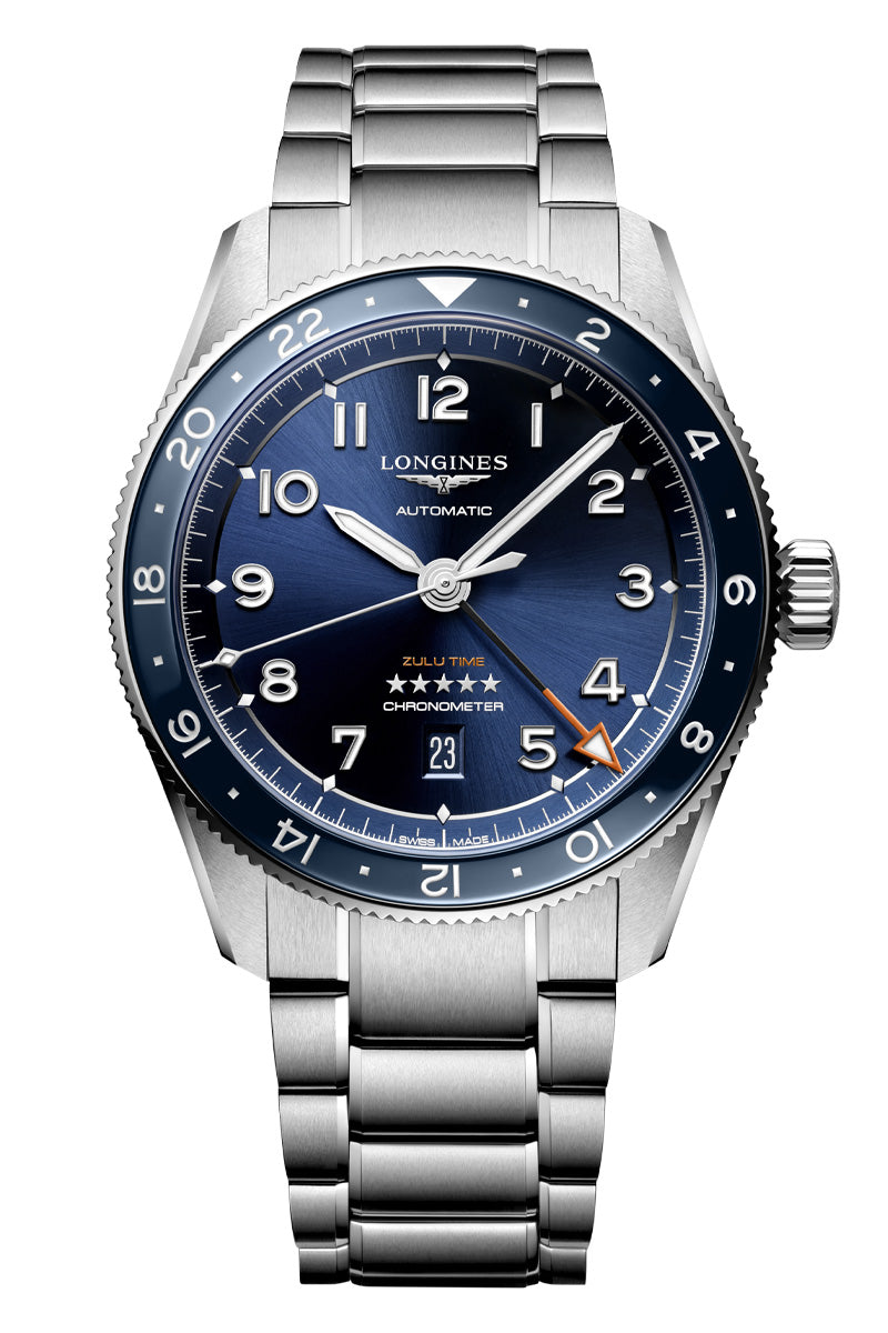Aesthetically, the Longines Spirit Zulu Time stands out with its meticulous execution and the particular care given to the various finishes on the details – whether shiny, matt, polished, in relief or embossed. This model features a bezel enhanced with a coloured ceramic insert, and is available on a sunray blue dial, with a date window now centred at the 6 o'clock position. The 42 mm steel case is accentuated by an interchangeable strap system.