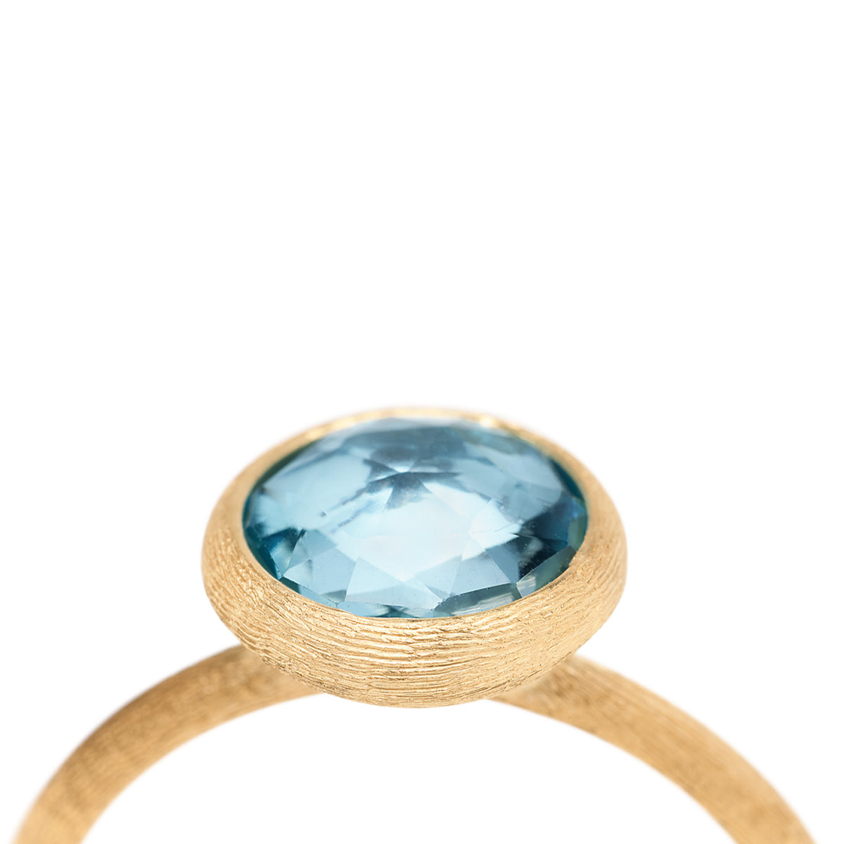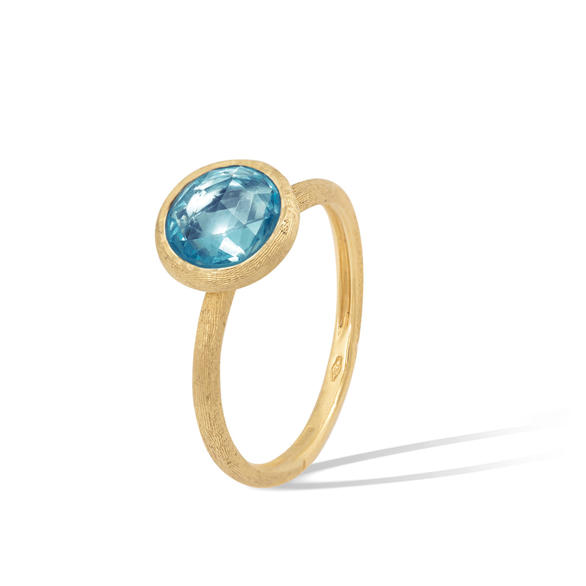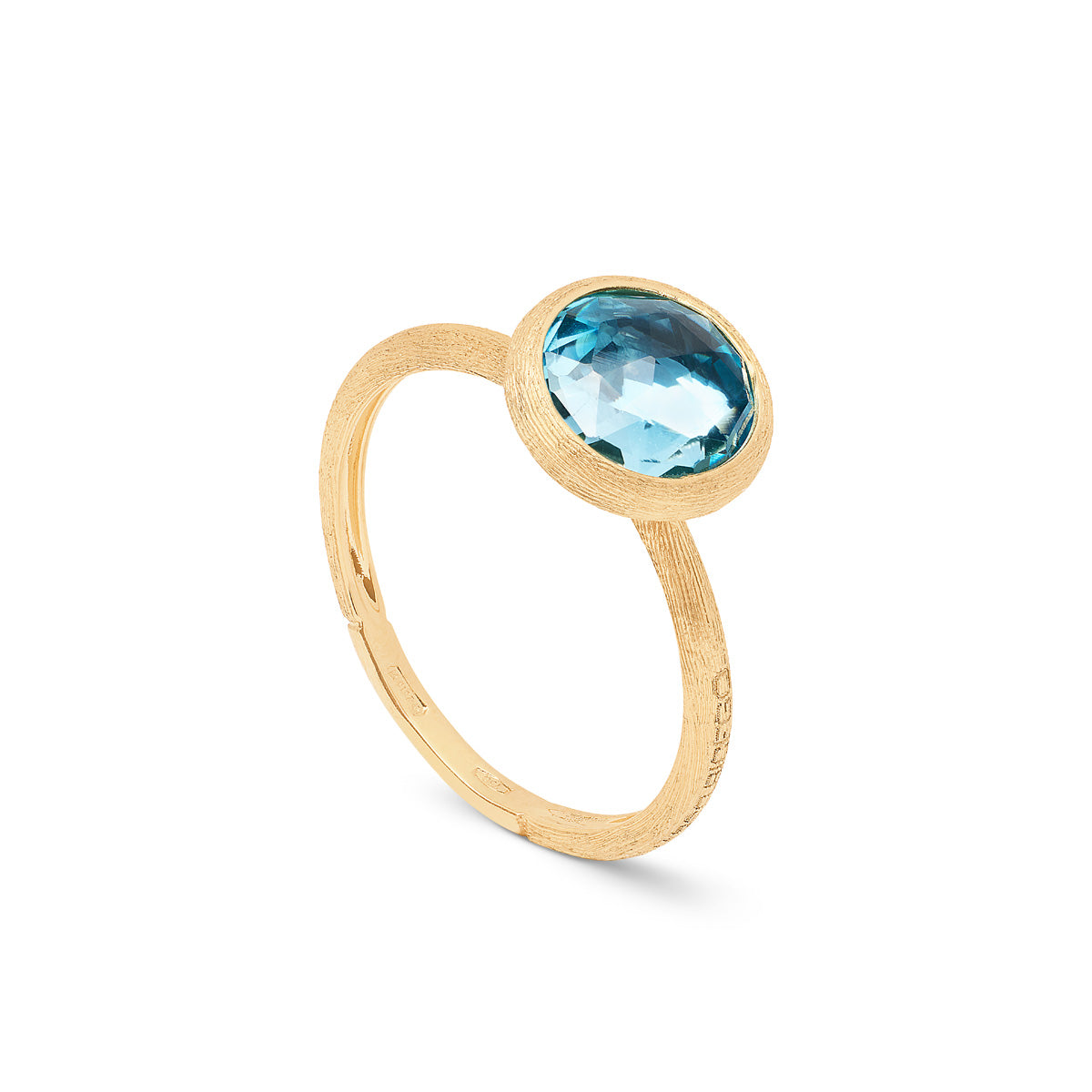 The Marco Bicego Jaipur collection showcases a playful mix of coloured gemstones, inspired by the vibrant country of India, set in 18kt yellow gold. The Marco Bicego Jaipur 18kt Yellow Gold Blue Topaz Ring is a classic piece that features a rose cut cushion Blue Topaz. The Blue Topaz gemstone is set onto an 18kt yellow gold band which is textured with the distinctive bulino technique for a unique finish to the piece.