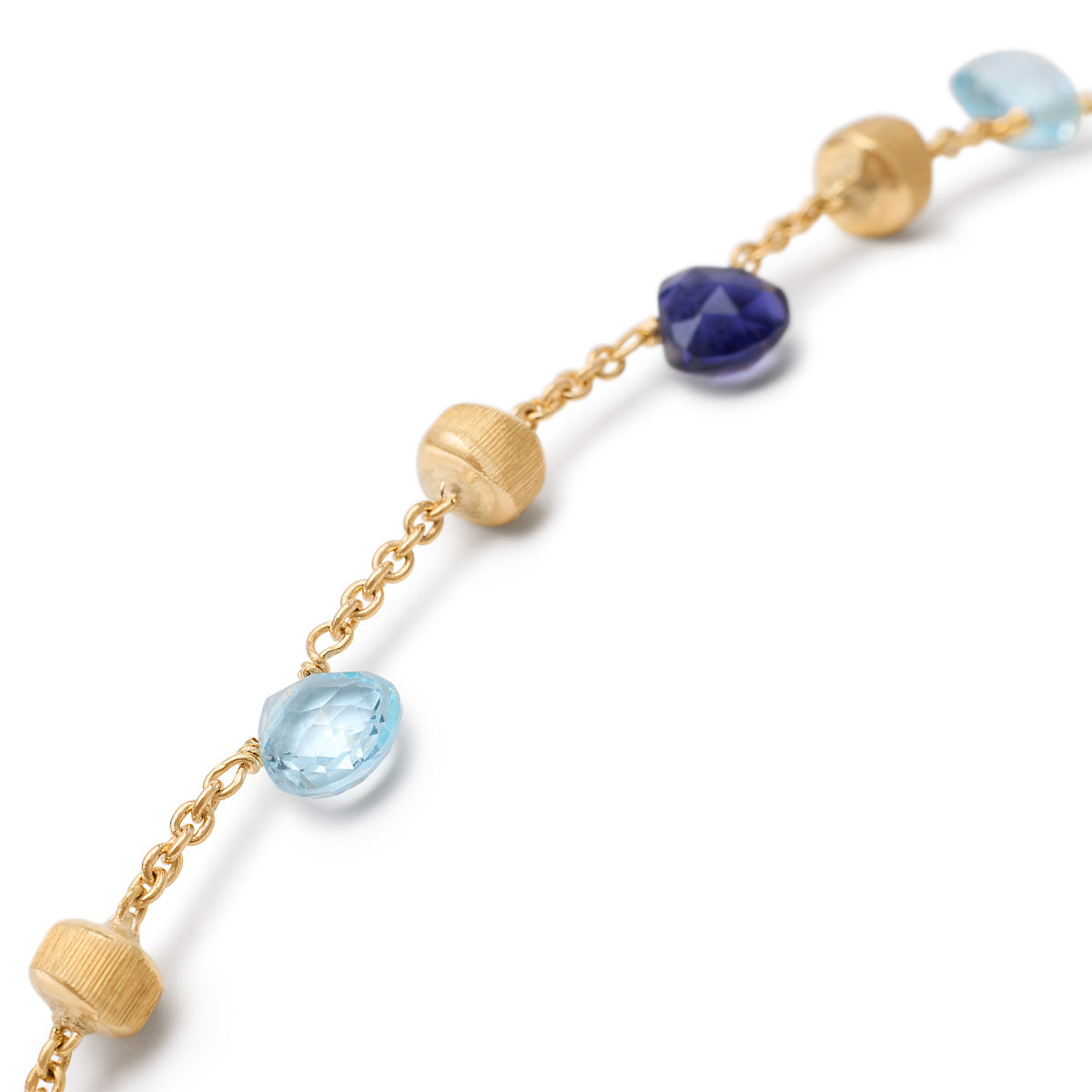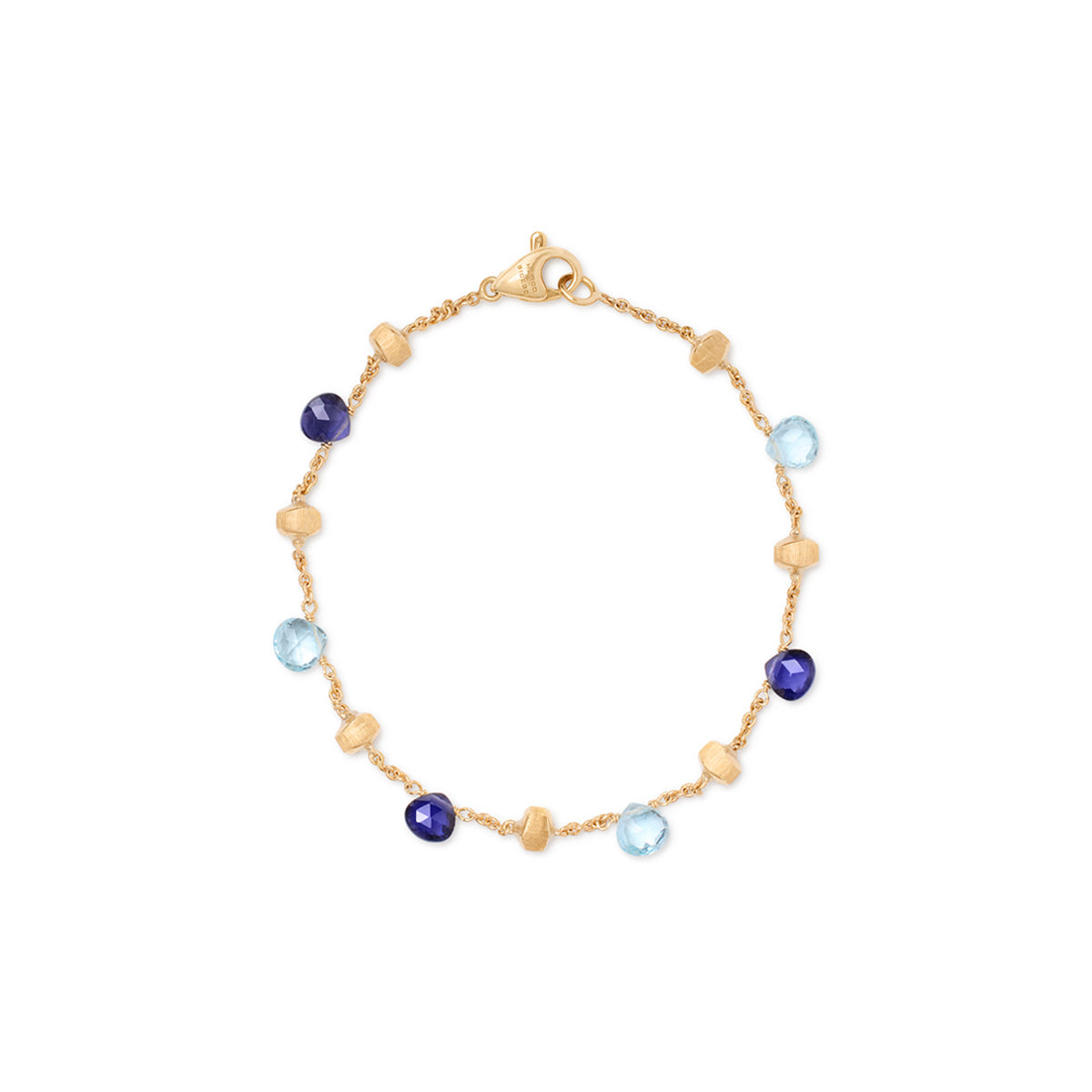 A light, elegant bracelet, perfect for wearing with other pieces from our collections. A mix of natural heart-cut mixed topaz stones are interspersed with precious 18K yellow gold nuggets, finely hand-engraved using an ancient Florentine technique.