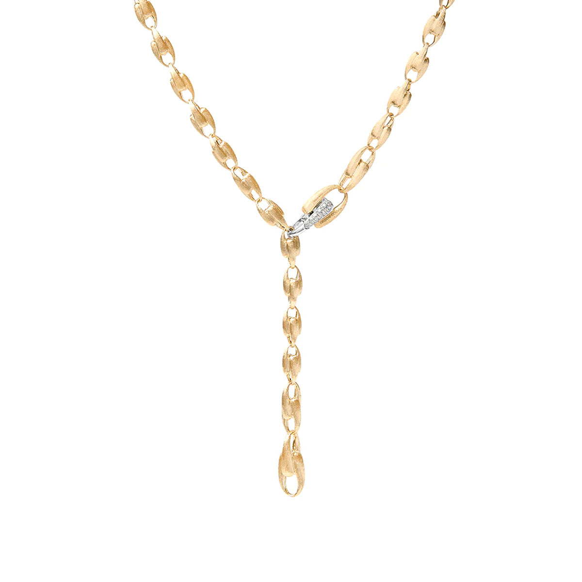 Elegant and sophisticated, this lariat necklace closes at the front of the neck, thanks to a pavé element of brilliant-cut diamonds. Made of 18K yellow gold, it is finely hand-engraved with the ancient Florentine technique. The adjustable chain makes it versatile and perfect for any neck.