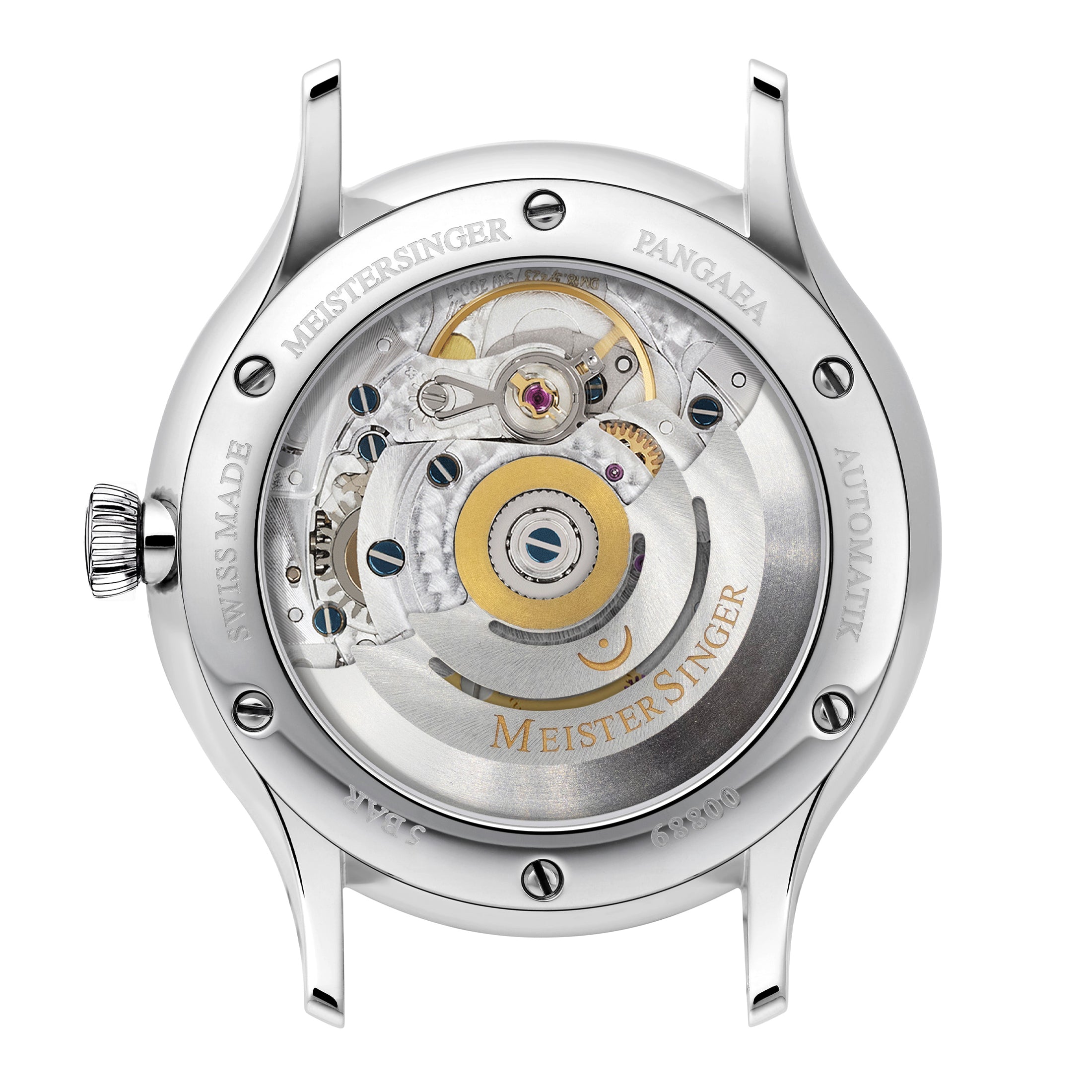 Apart from its slim 40-mm case, the finely curved serif typeface contributes towards its visual lightness. The watch is powered by a Swiss automatic movement. The glass back of the Pangaea provides a clear view of how the rotor, which is engraved with a golden MeisterSinger logo, supplies the movement with power. The exhibition back is fastened with six screws and the stainless steel case of the Pangaea is water-resistant up to 5 bar.