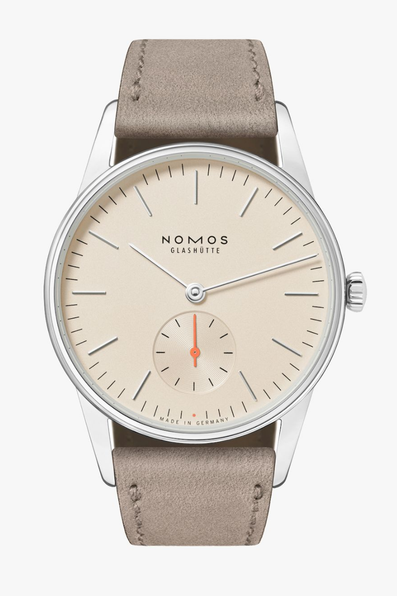 Quite possibly the finest yield of a very vintage year. Orion 33 champagne combines flowing lines and an impeccably reduced aesthetic. The champagne-colored dial is visible through the domed sapphire crystal glass and punctuated with diamond-polished indexes. Its glamorous appeal is rather understated, which only makes it all the more beautiful. The NOMOS caliber Alpha ticks within.