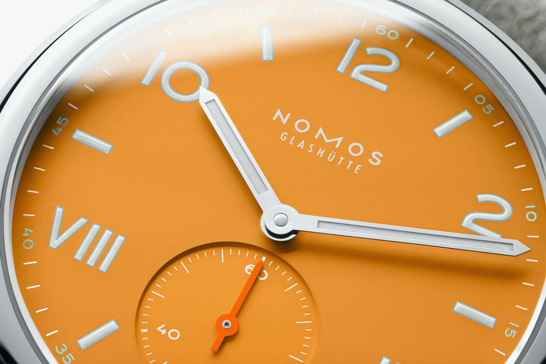 - Dial: Orange with Arabic and Roman numerals ("California Dial") and indexes with white Superluminova (blue luminescence). Hour & minute hands are rhodium-plated, with Superluminova inlay in white, seconds hand in neon orange