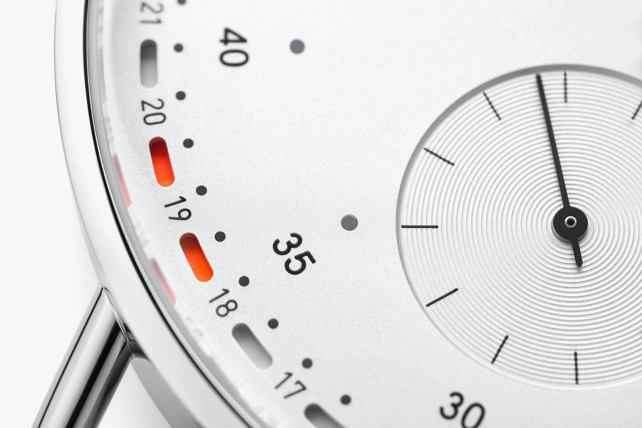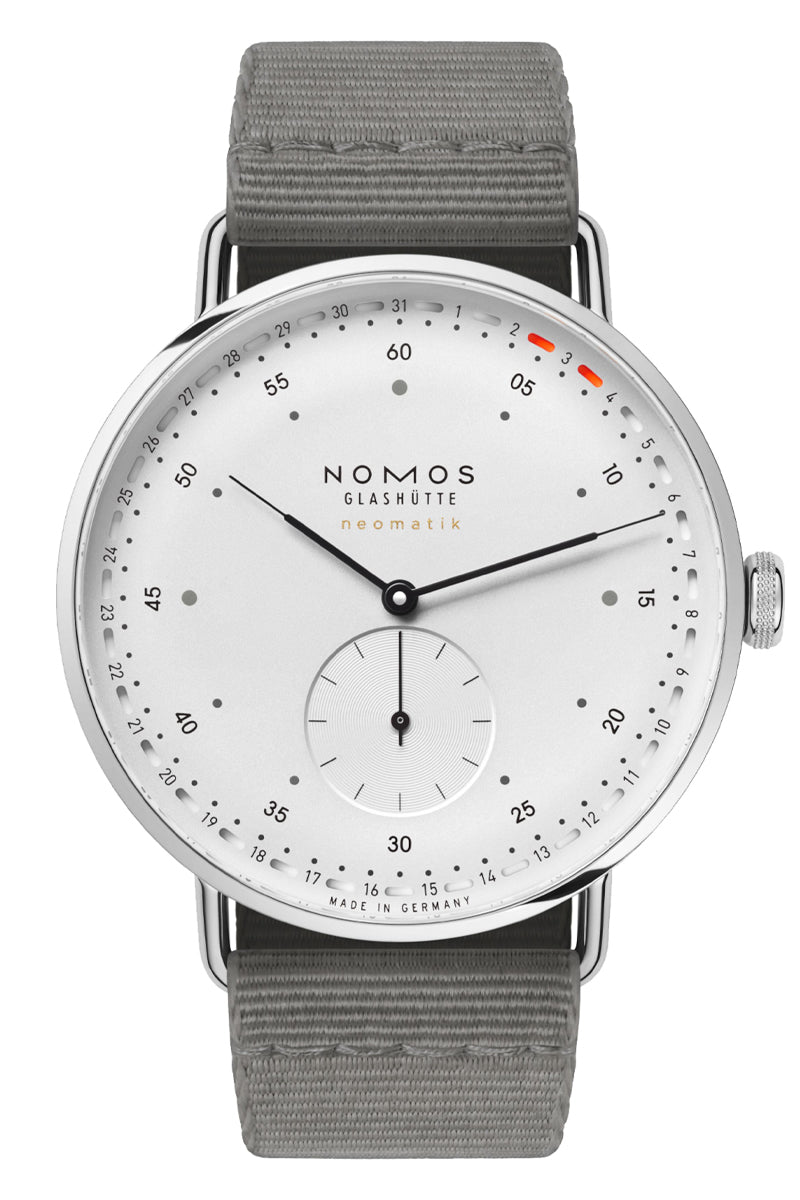 Cosmopolitan, smart, with plenty of contemporary flair—that is Metro. As the version Metro neomatik 41 Update, this watch also loves clear forms. The unique, patented NOMOS ring date in neon orange is a sign of new times to come: The iconic design of Metro nevertheless remains unmistakably Metro.