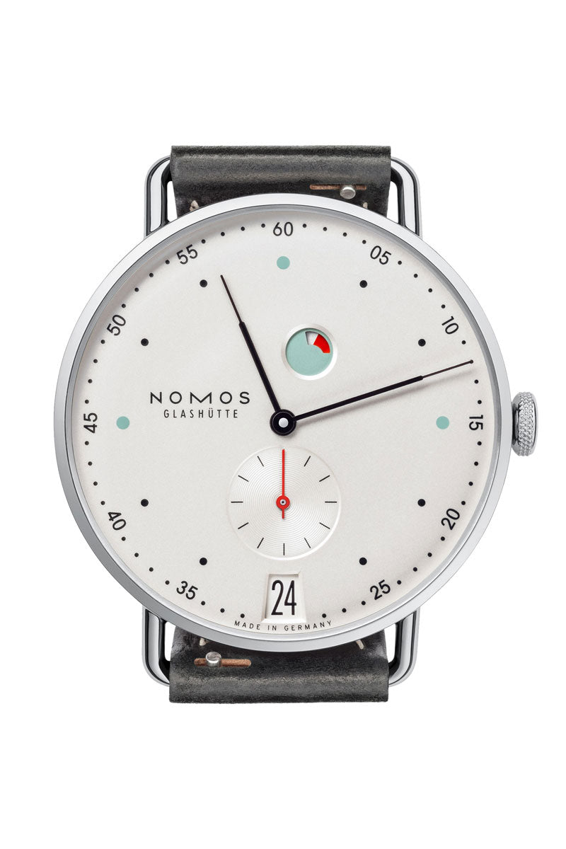 Metro date power reserve, designed by Mark Braun, is young and sophisticated, yet Glashütte through and through. The power reserve indicator doesn’t only remind wearers when to rewind, it is also one of the design features. Others include hands as fine as quill tips and colorful hour indexes. And the hand-wound NOMOS caliber DUW 4401 is within, setting the pace, equipped with our proprietary escapement.