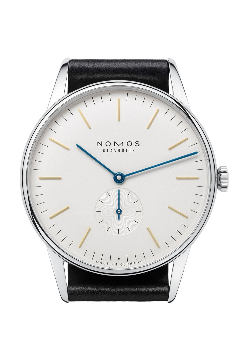 More Orion: With a 38-millimeter diameter this timepiece deserves its place among the larger models from NOMOS. Yet, with the curved dial and sapphire crystal glass, it still feels particularly slender and elegant. Also big league: the tempered blue hands on the white silver-plated dial face. Behind it, the hand-wound caliber Alpha is at work—reliably and with the highest precision.
