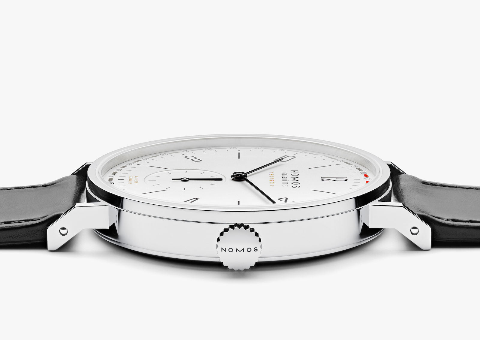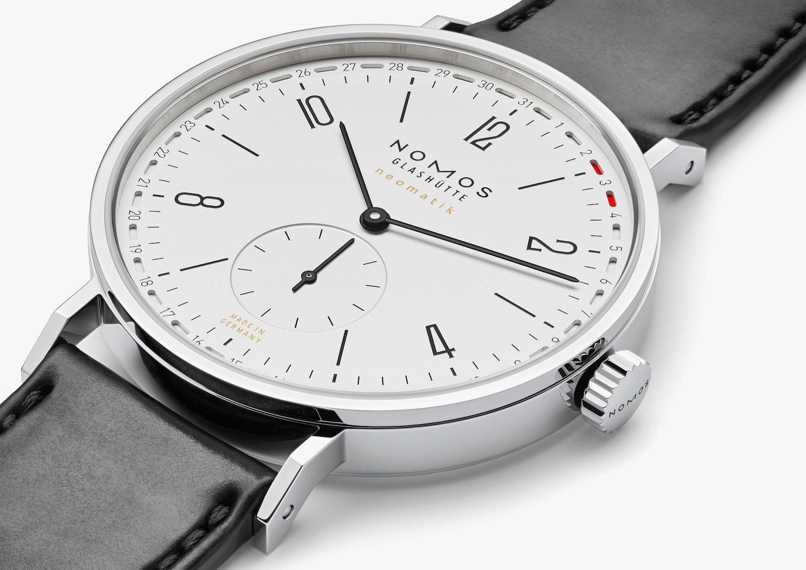 Tangente, the iconic NOMOS timepiece, is celebrating its updated date from all sides—and interpreting it in an entirely new way: The date ring, placed far out around the edge of the dial, features two red dots that frame the current date. An aesthetic that can be attributed to the new neomatik caliber within. It's unique, and unmistakably NOMOS Glashütte.