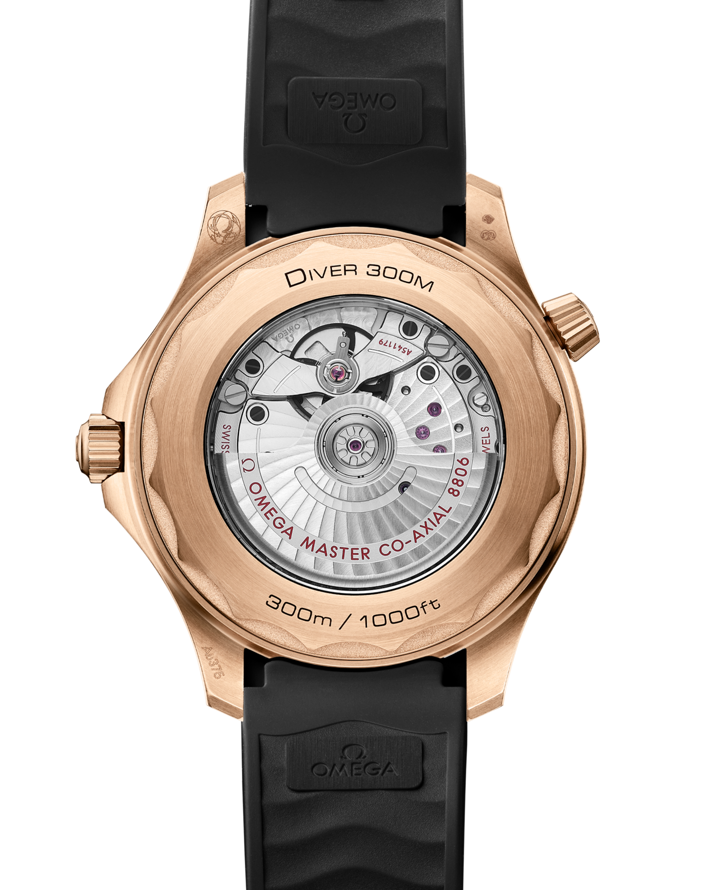 The watch is presented on an integrated black rubber strap with buckle, and is driven by the OMEGA Co-Axial Master Chronometer Calibre 8806, which can be seen through the sapphire-crystal caseback.