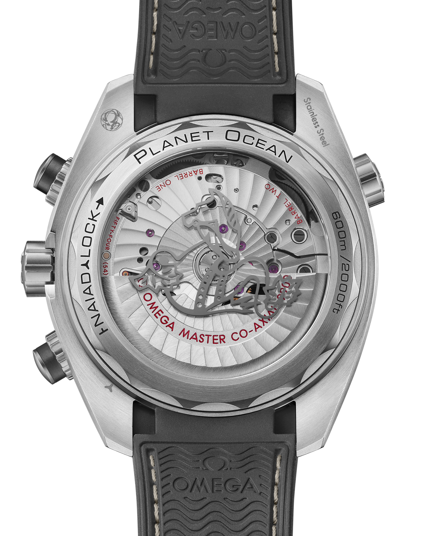 Powered by the Co-Axial Master Chronometer Calibre 9900, this Seamaster Planet Ocean is worn on an integrated beige rubber strap with a structured pattern and white stitching. The NAIAD LOCK caseback is completed with a metallized seahorse on the sapphire crystal — a further nod to the original Planet Ocean references and beyond.