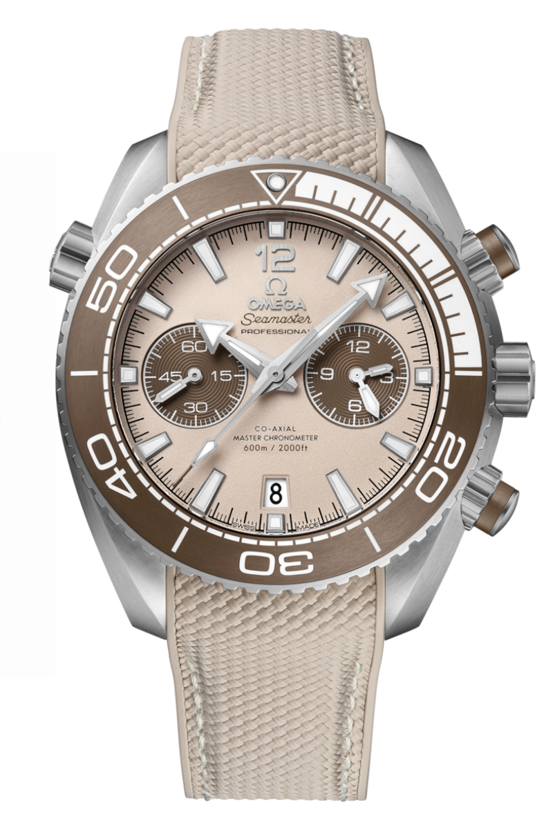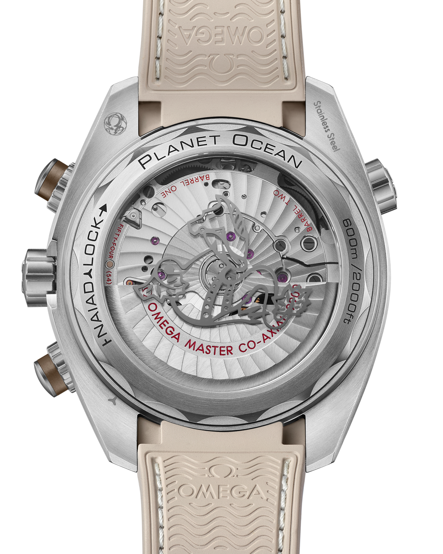 Powered by the Co-Axial Master Chronometer Calibre 9900, this Seamaster Planet Ocean is worn on an integrated beige rubber strap with a structured pattern and white stitching. The NAIAD LOCK caseback is completed with a metallized seahorse on the sapphire crystal — a further nod to the original Planet Ocean references and beyond.