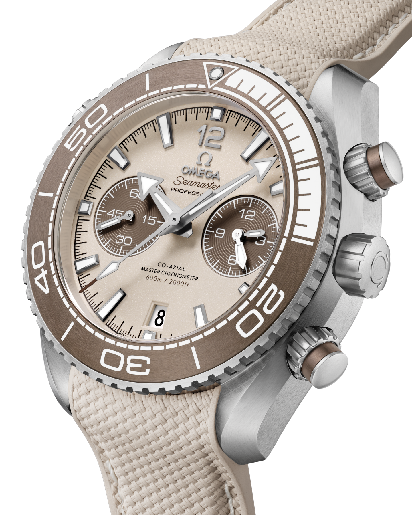 For this chronograph model, the 45.50 mm case is crafted in brushed stainless steel and features pushers with brushed silicon nitride ceramic rings color-matched to the dial. The same bronze colour is used for the brushed silicon nitride ceramic bezel ring with its diving scale in liquid ceramic and Super-LumiNova.