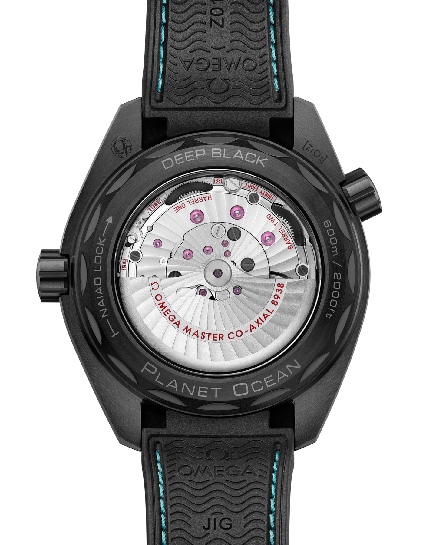 This Worldtimer is worn on an integrated strap in black structured rubber with turquoise stitching and a foldover clasp in ceramic and ceramised titanium. Powering the watch is OMEGA’s Co-Axial Master Chronometer Calibre 8938, which can be seen through the sapphire crystal caseback.
