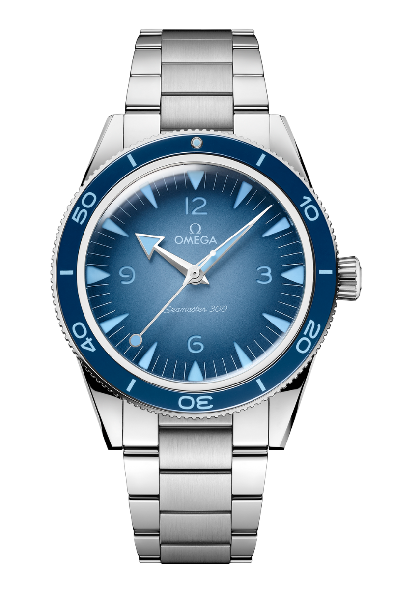 The varnished dial, in OMEGA’s own Summer Blue, has a gradient finish to reflect the watch’s level of water resistance. In keeping with the colour code, OMEGA has filled the rhodium-plated hands, recessed hour markers, and open numerals with a unique light blue Super-LumiNova.
