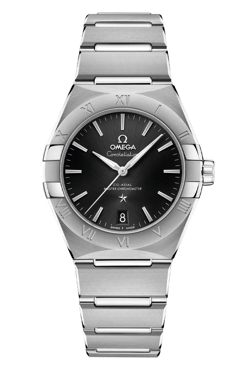 This 36 mm stainless steel model features a bezel engraved with Roman numerals, a sun-brushed black dial and a date window at the 6 o'clock position. The hands, OMEGA logo, Constellation star and indexes are all in 18K white gold.
