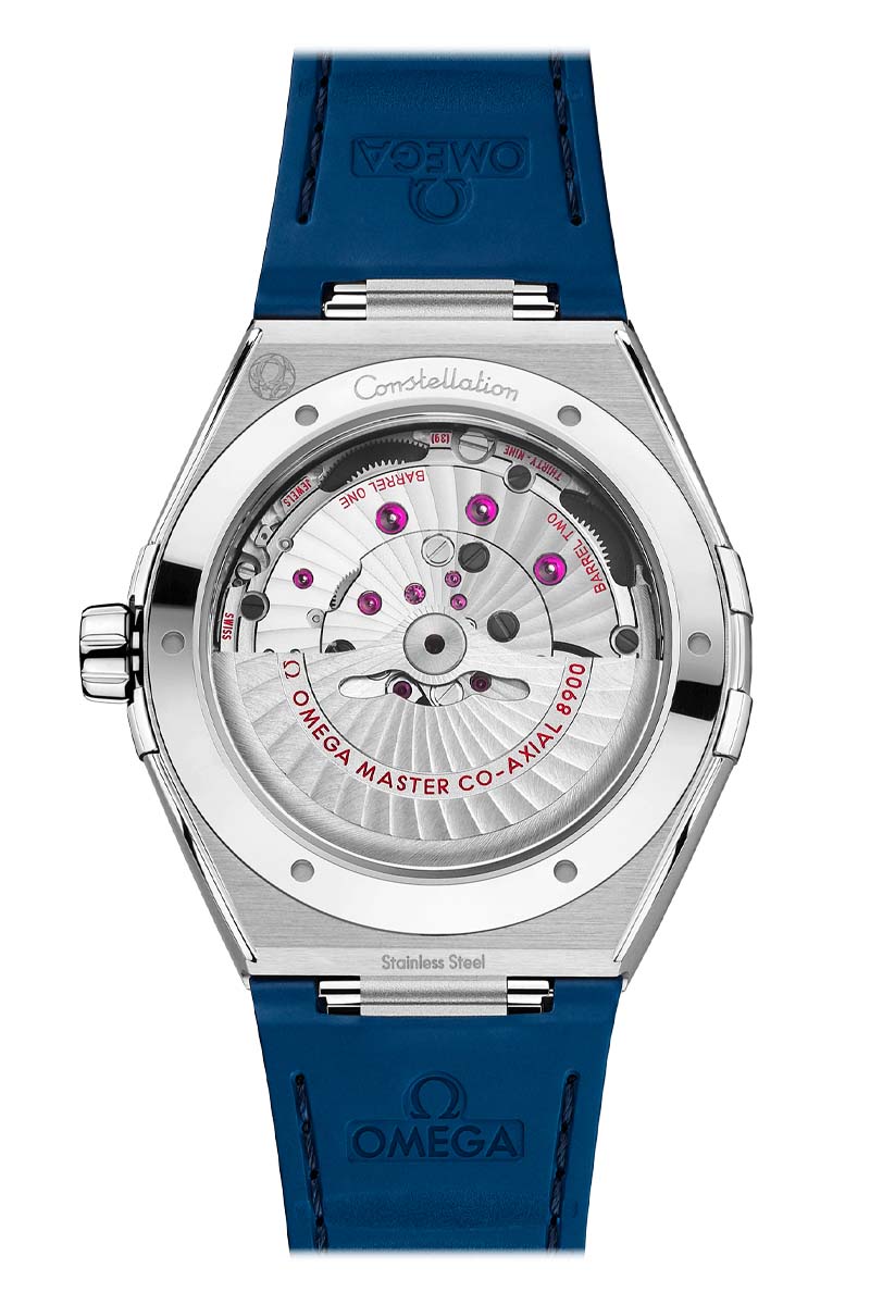 Presented on a blue leather strap with rubber lining, this timepiece is driven by the OMEGA Co-Axial Master Chronometer Calibre 8900, visible through the domed scratch-resistant sapphire crystal.