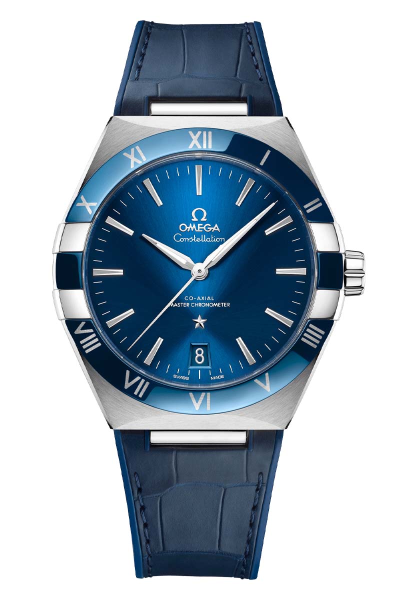 This 41 mm stainless steel model features a polished blue ceramic bezel with Roman numerals in Liquidmetal™, a sun-brushed blue dial and a date window at the 6 o'clock position. The hands, OMEGA logo, Constellation star and facetted indexes are all rhodium-plated.