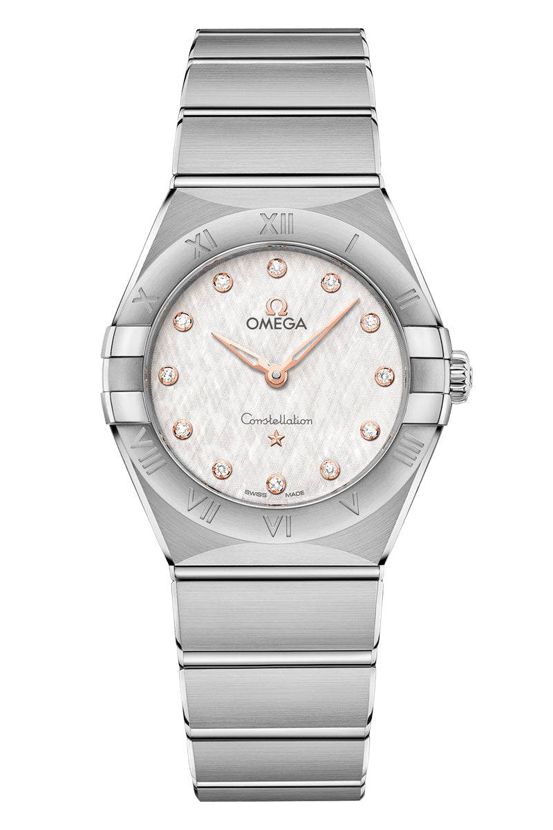This 28 mm stainless steel model features a bezel engraved with Roman numerals, cream silvery dial with silk-like pattern and scratch-resistant sapphire crystal. The hands, OMEGA logo, Constellation star and diamond holders are in 18K Sedna™ gold.