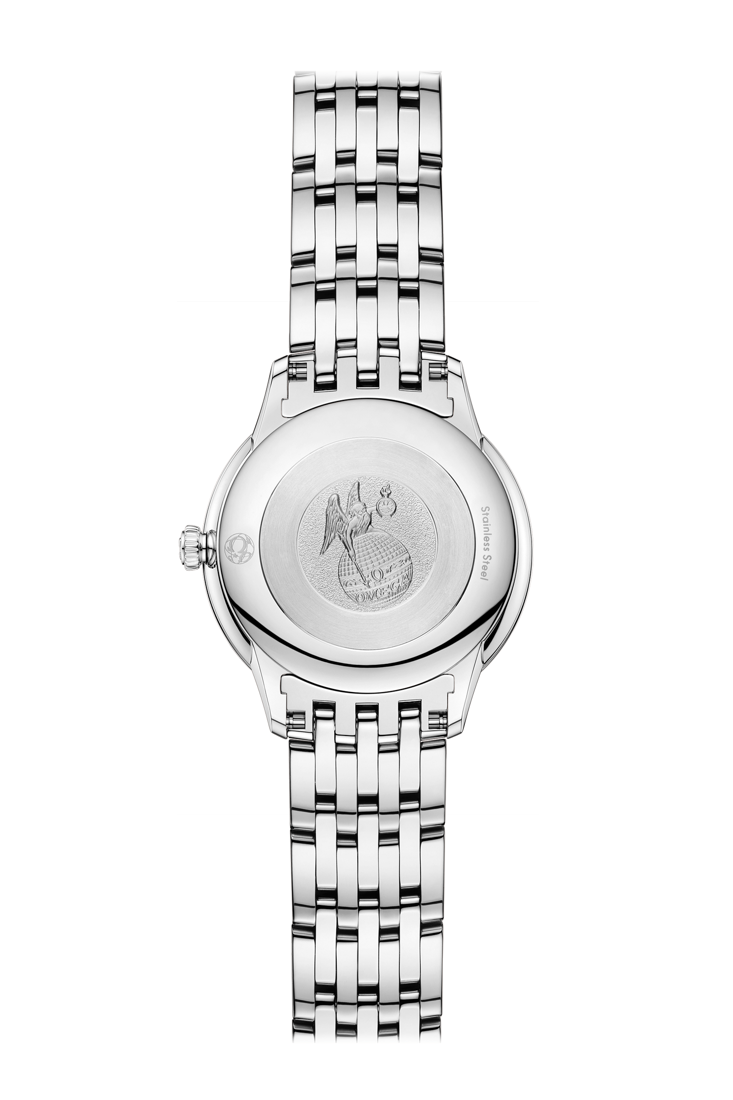 This watch is presented on a stainless steel bracelet and is driven by the Omega Quartz Calibre 4061, with a battery life of at least 48 months.