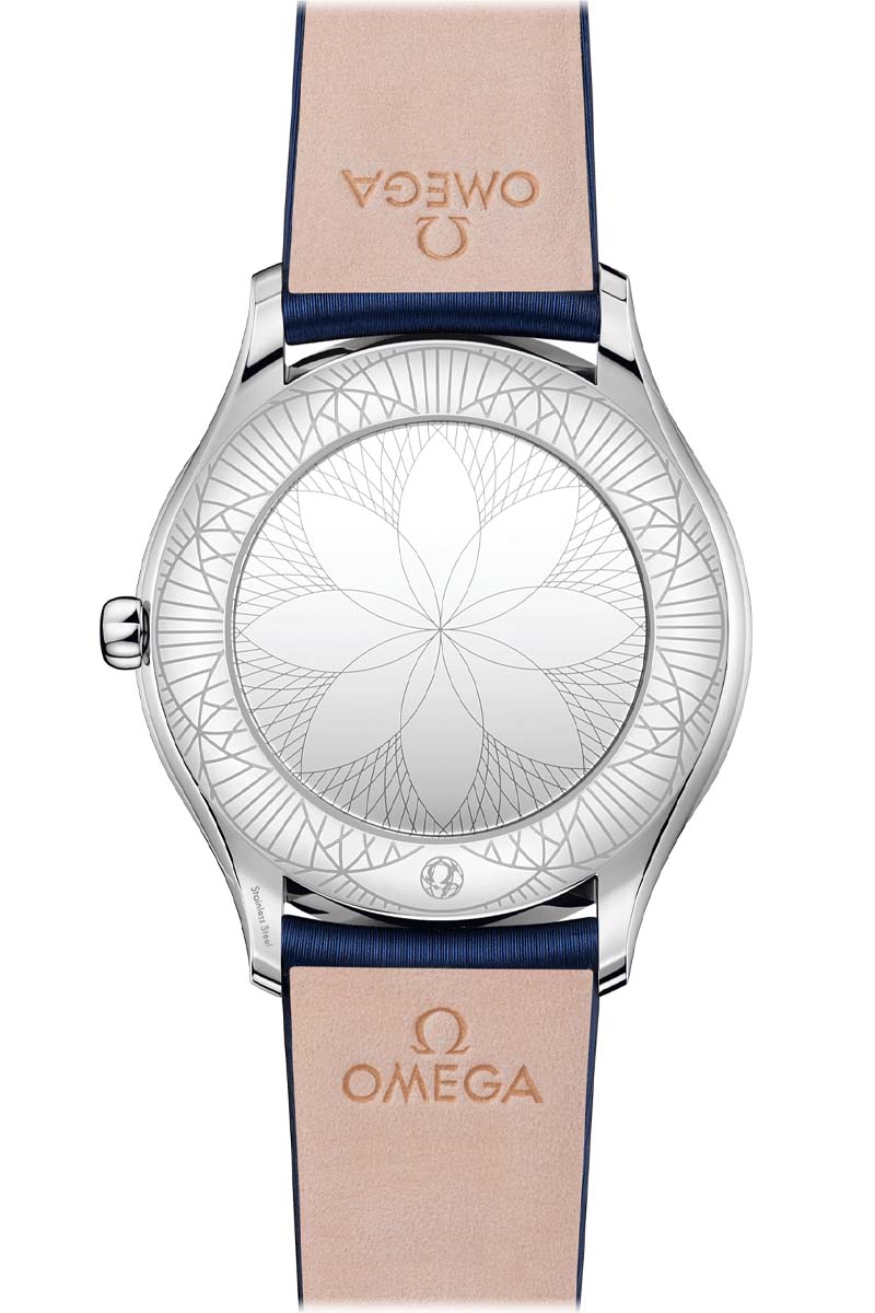 The watch is driven by the OMEGA calibre 4061, which sits behind a special mirrored caseback with a “Her Time” pattern. Finally, the watch is presented on a blue fabric strap.