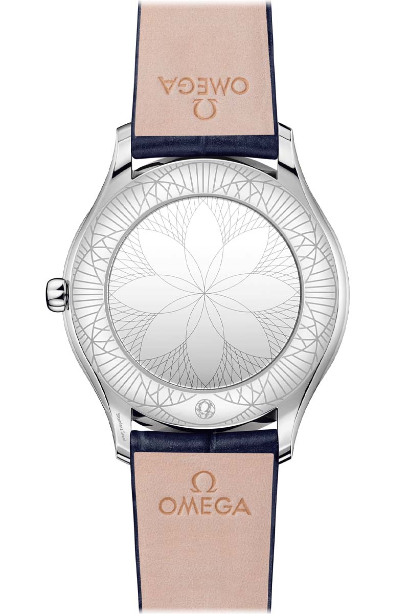 The watch is driven by the OMEGA calibre 4061, which sits behind a special mirrored caseback with a “Her Time” pattern. Finally, the watch is presented on a blue leather strap.
